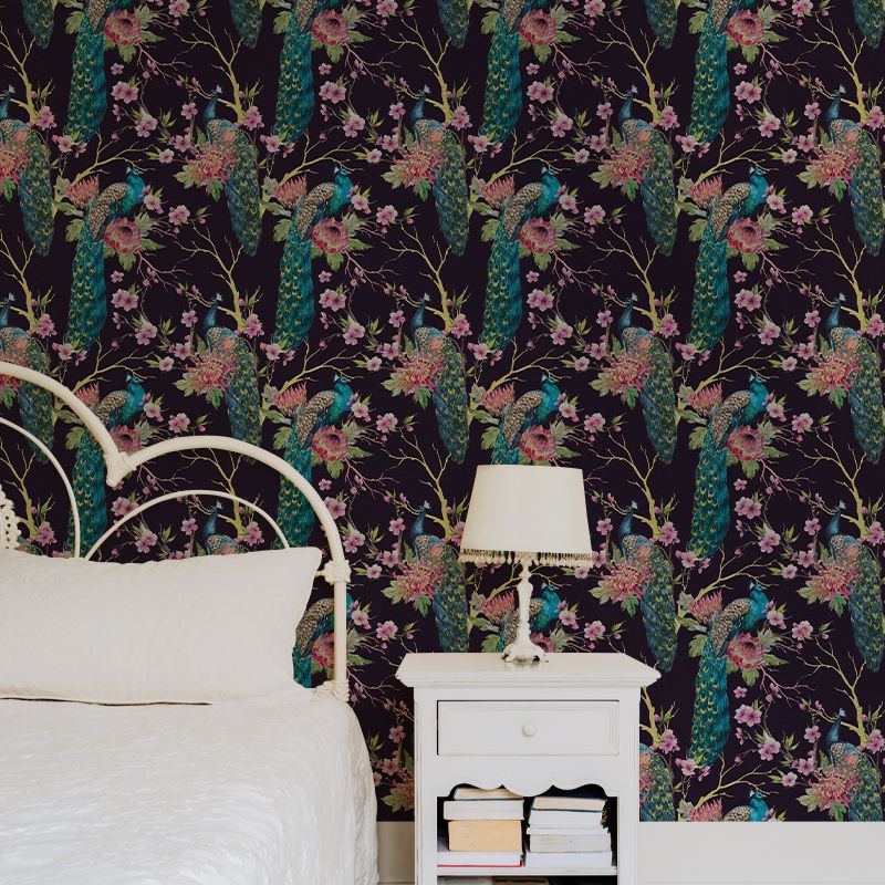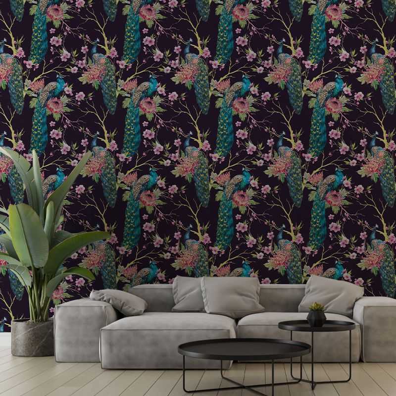 Adaugă o notă de eleganță și rafinament casei tale cu acest tapet cu pauni. Designul impresionant cu pauni și flori roz pe fundal mov închis va transforma orice cameră într-un spațiu elegant și sofisticat. Tapetul este perfect pentru dormitoare, livinguri sau chiar birouri, adăugând un strop de lux și personalitate oricărui decor.