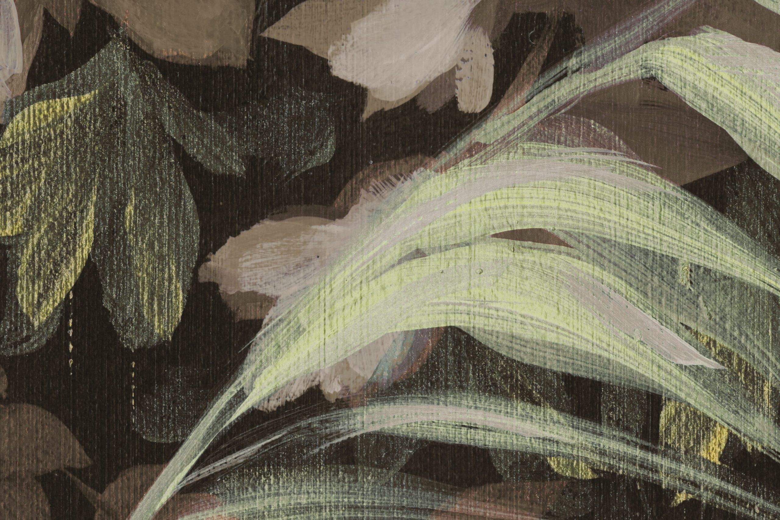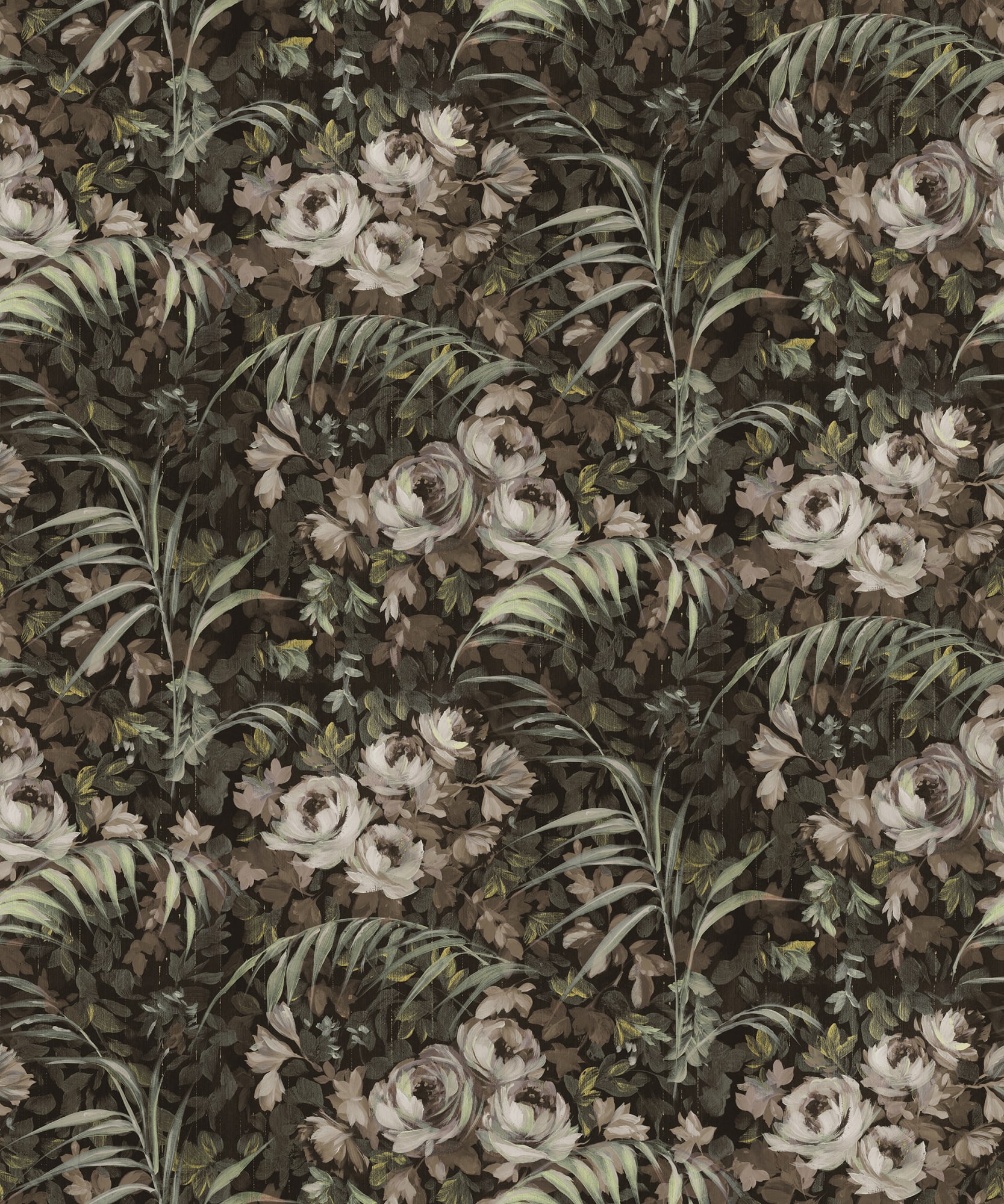 Flori, frunze și ramuri de palmier în verde închis, tonuri nisipoase moi, cu detalii aurii. Acest model creează cu siguranță un fundal uimitor pentru scena ta de zi cu zi. Profunzimea designului și modelul la scară largă creează un efect instantaneu de wow și o senzație confortabilă și oarecum mistică. Se potrivește tuturor camerelor, dar este deosebit de strălucitor în budoarul tău!