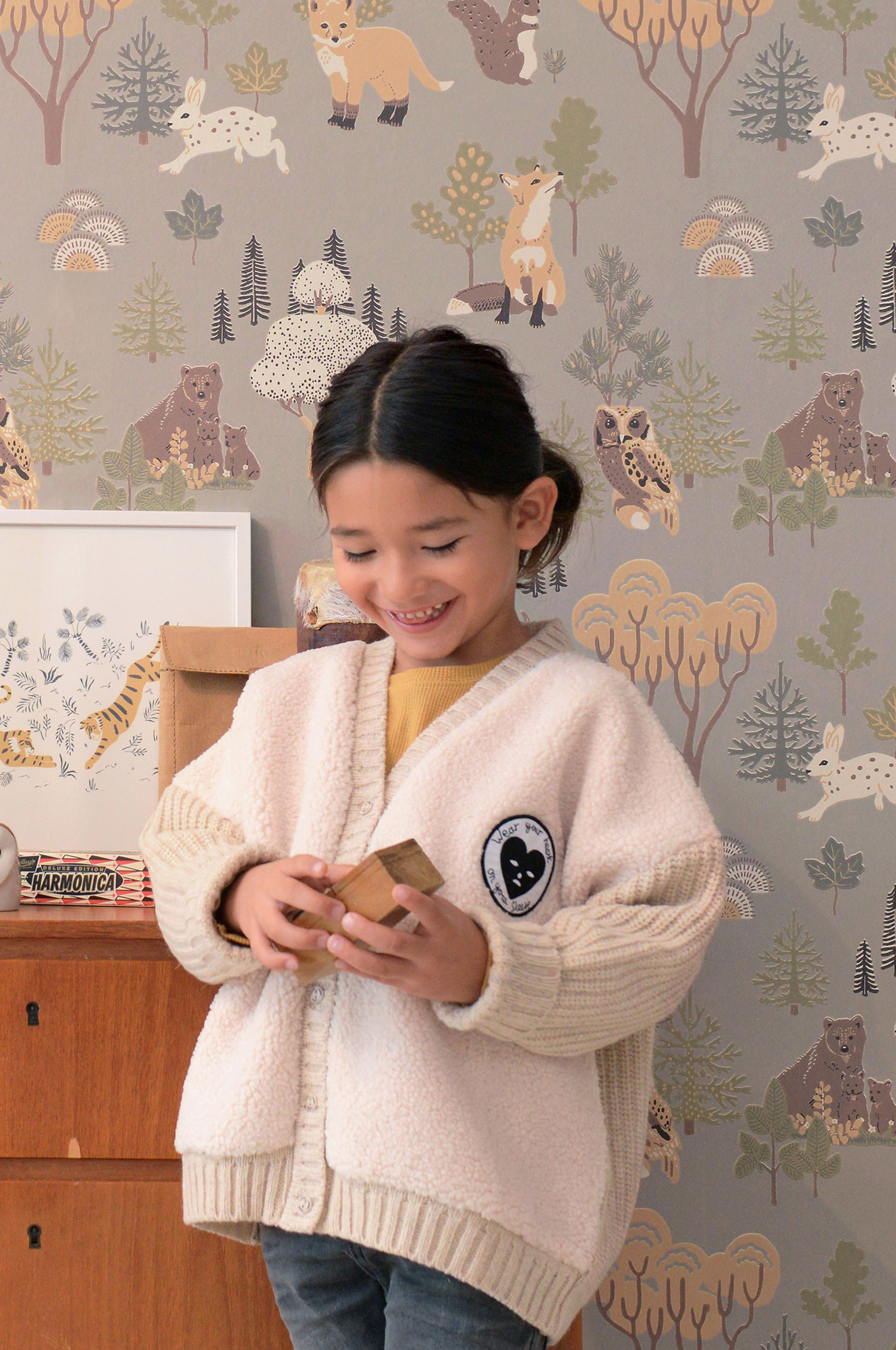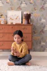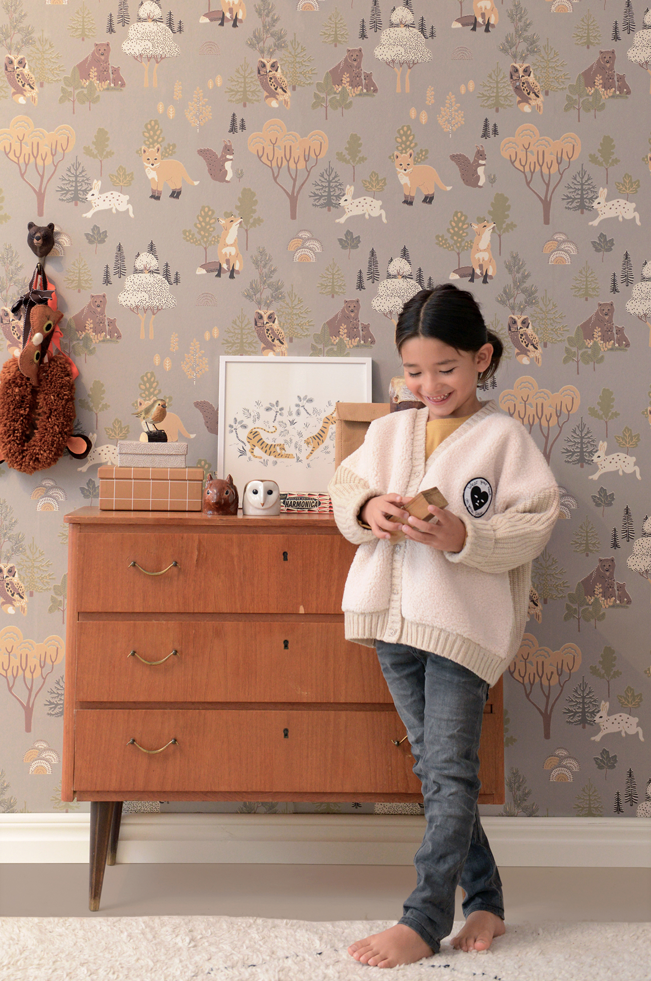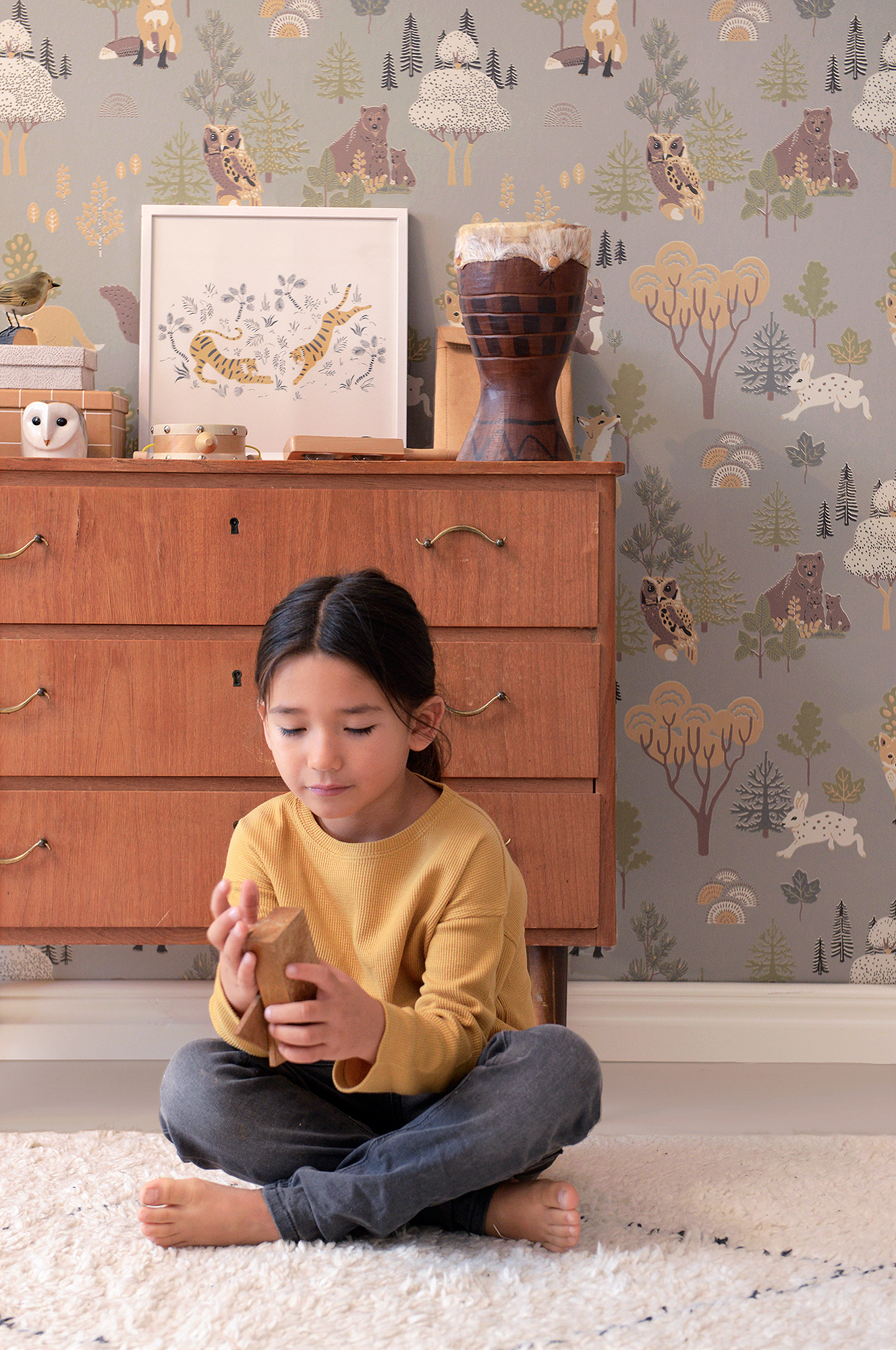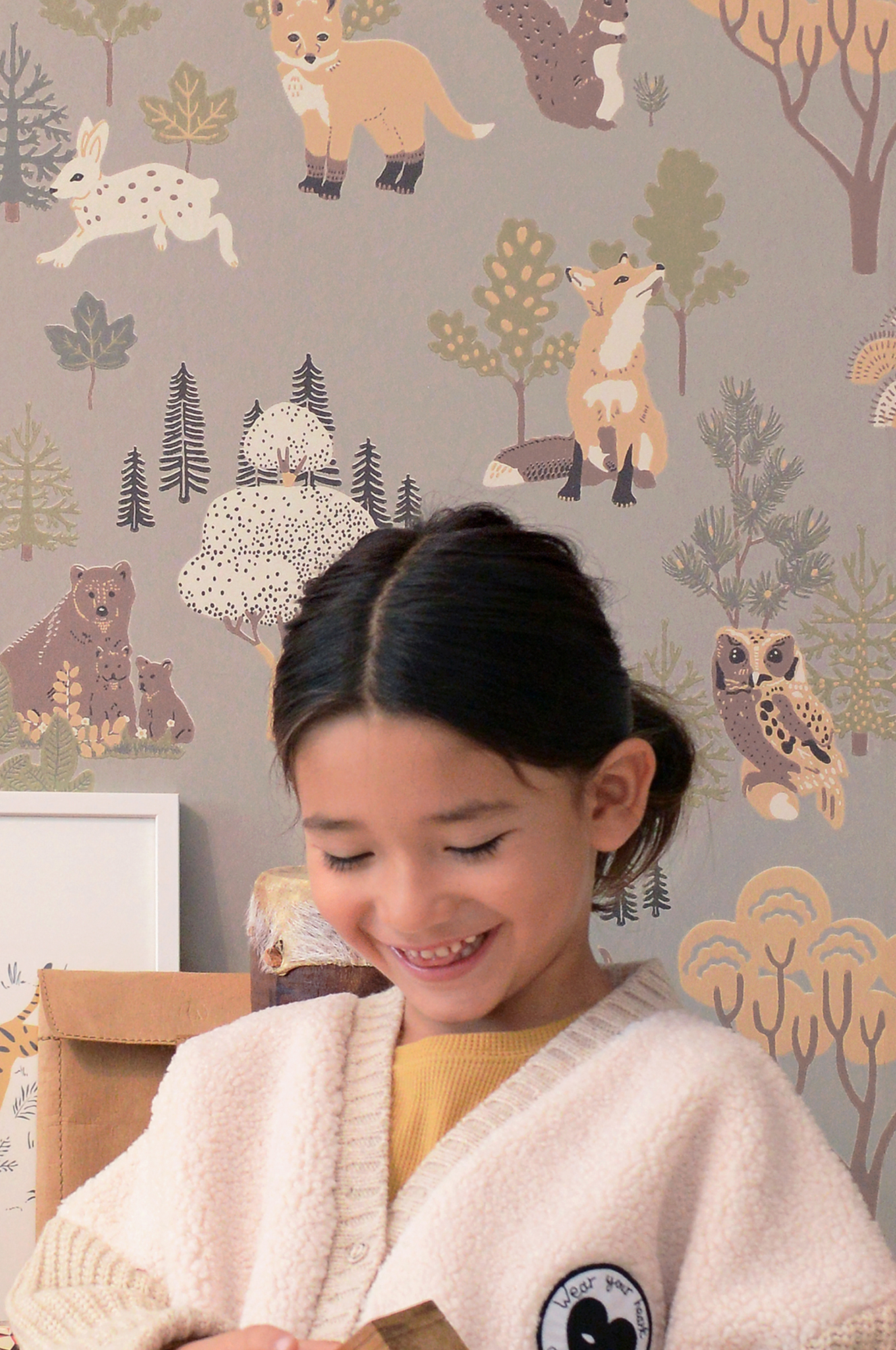 Descoperă magia pădurii cu acest Deep Forest. O combinație delicată de griuri cu accente de bej, verde și maro, pe un fundal gri, creează o atmosferă liniștitoare și plină de farmec. Animalele drăguțe și copacii simpatici aduc o notă de joacă și prospețime.