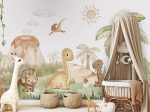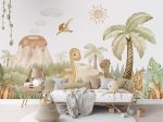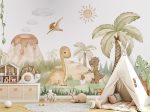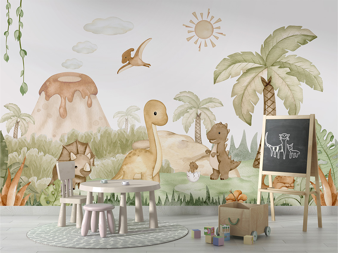 Un tapet cu design delicat, perfect pentru camera bebelușului, cu dinozauri simpatici, un vulcan, palmieri și nori pufoși. Tapetul este realizat din materiale de înaltă calitate, rezistente și ușor de curățat.