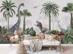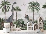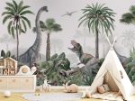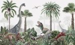 Acest design spectaculos te transportă într-o junglă plină de viață, unde dinozaurii se plimbă printre palmieri și plante tropicale. Un T-Rex impunător cu gura deschisă, un dinozaur cu gât lung și alți dinozauri ascunși printre frunze, creează o atmosferă magică. Perfect pentru camera copiilor, acest design va stârni imaginația și pasiunea pentru dinozauri.