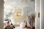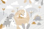 Peisaje cu dinozauri: Tapetul Dinosaur Land, Beige reînvie era preistorică cu o notă fermecătoare. Munții blânzi servesc ca fundal pentru dinozauri adorabili, creând o scenă jucăușă și educativă pentru copii.