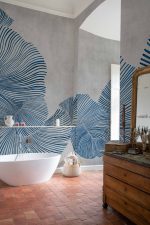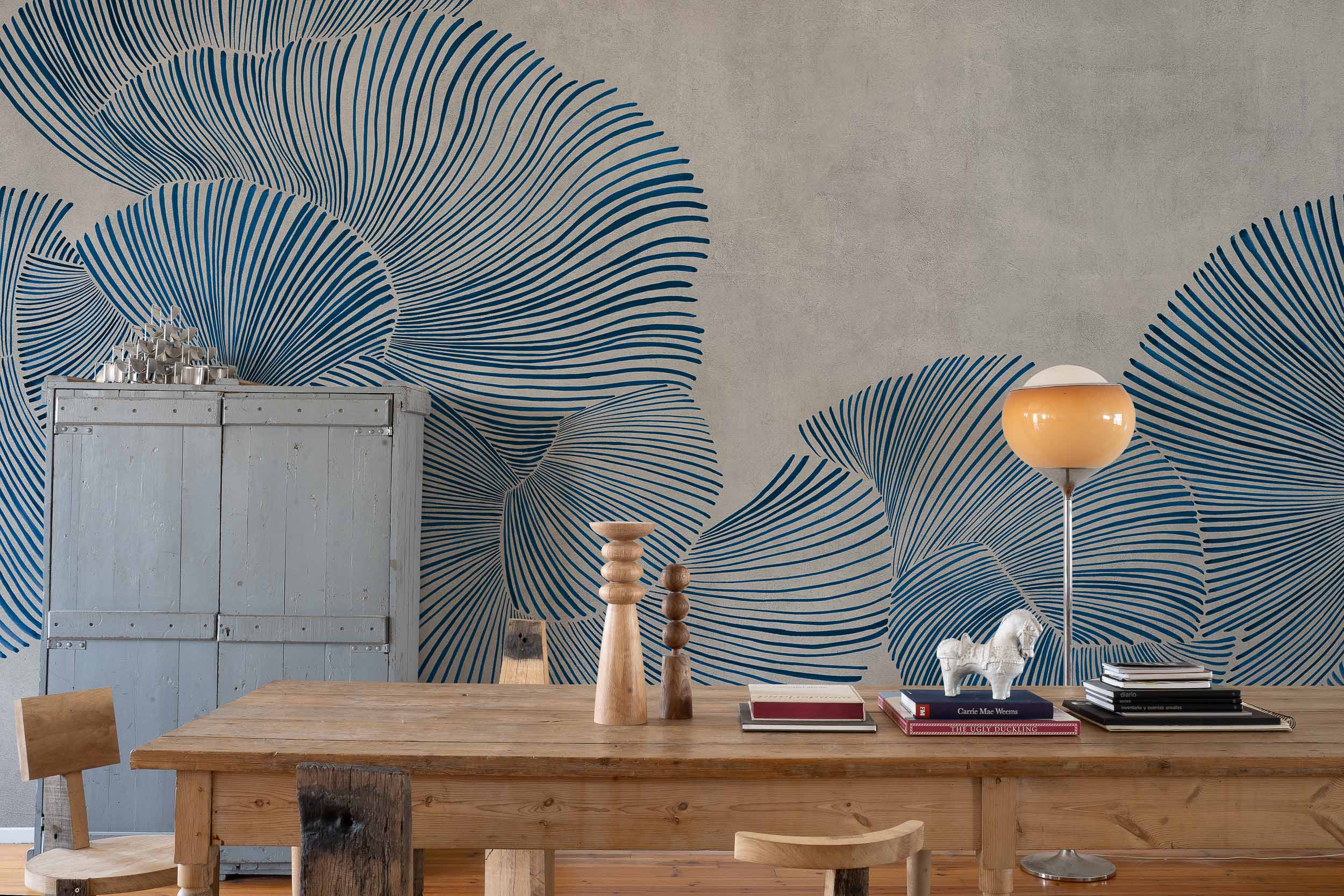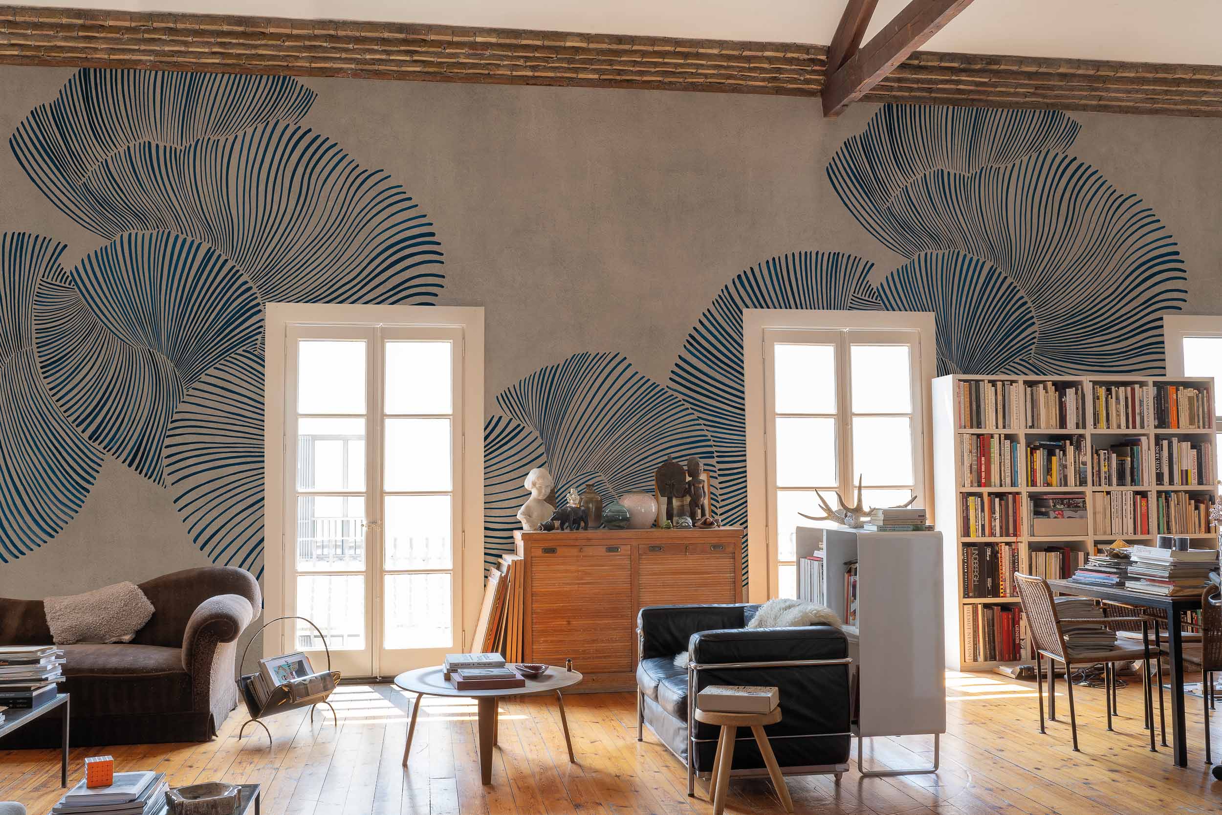 Tapetul Diving Moment, Blue de la Coordonné este un design texturat în tonuri de albastru/bleumarin din colecția Central Saint Martins – Rest Time. „Scufundarea sub apă, înconjurat de specii marine unice și plante, m-a fascinat întotdeauna.” – spune creatoarea designului, Tae Eun Kim.