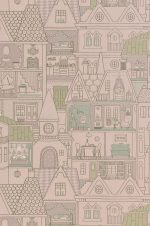My Farm, Soft Pink Un tapet cu un design adorabil pentru camera copiilor, cu un motiv delicat de fermecătoare case,