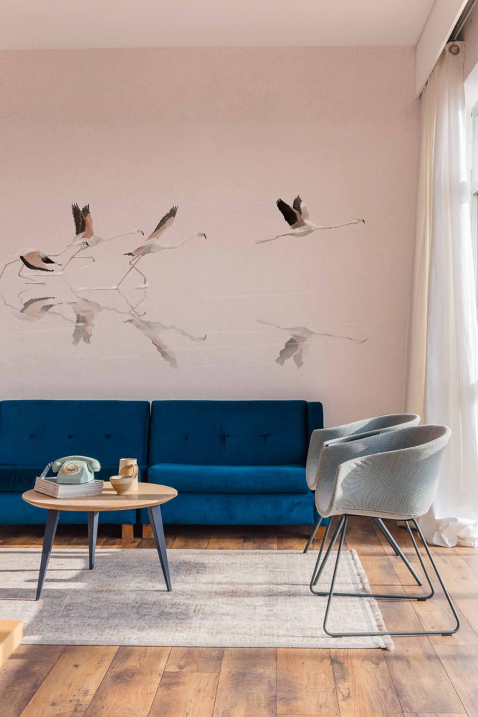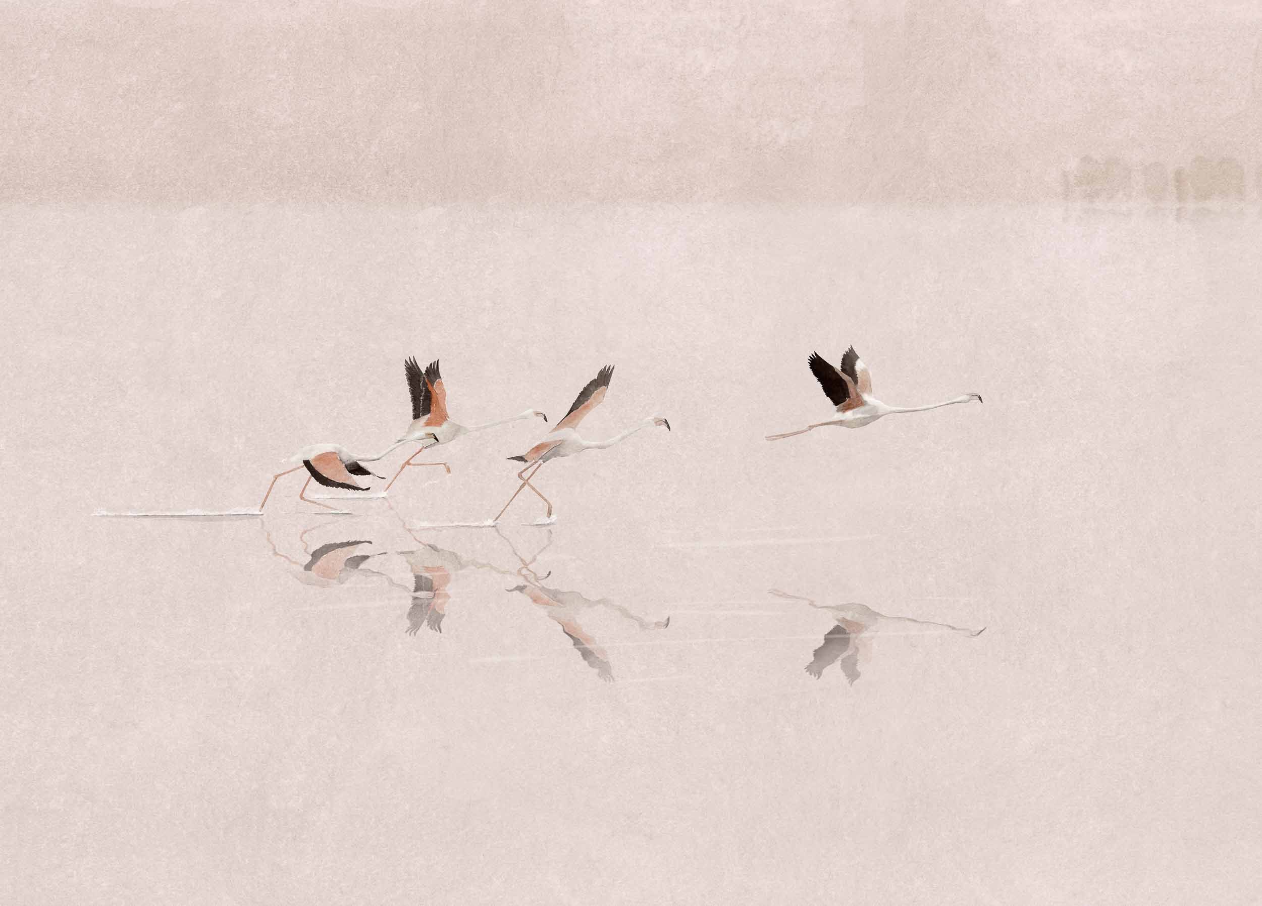 O familie de flamingo care își ia zborul în zori, purtând emoția unei călătorii migratoare. O atmosferă epică, cu accente zen, inspirată de liniștea unei zone naturale protejate.