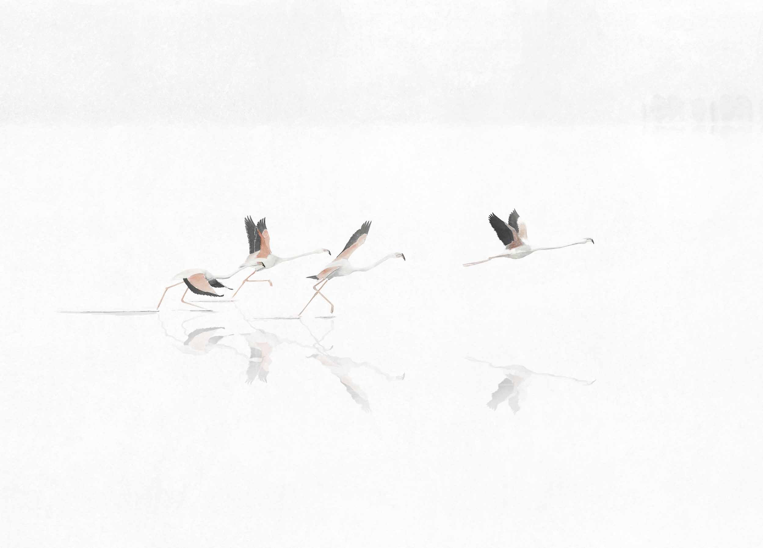 O familie de flamingo care își ia zborul în zori, purtând emoția unei călătorii migratoare. O atmosferă epică, cu accente zen, inspirată de liniștea unei zone naturale protejate.