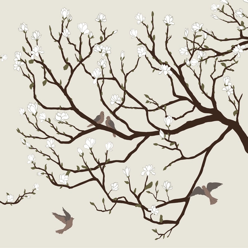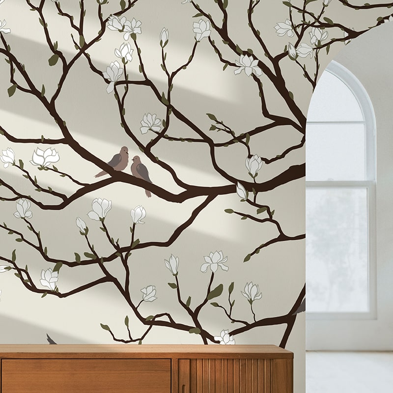 Alege Doves at my window pentru a crea o ambianță relaxantă și elegantă în casa ta. Cu un design delicat, cu ramuri de magnolie și porumbei, tapetul este perfect pentru un living, dormitor sau birou. Tonurile pastelate și motivele florale aduc un aer proaspăt și elegant, creând o atmosferă caldă și primitoare.