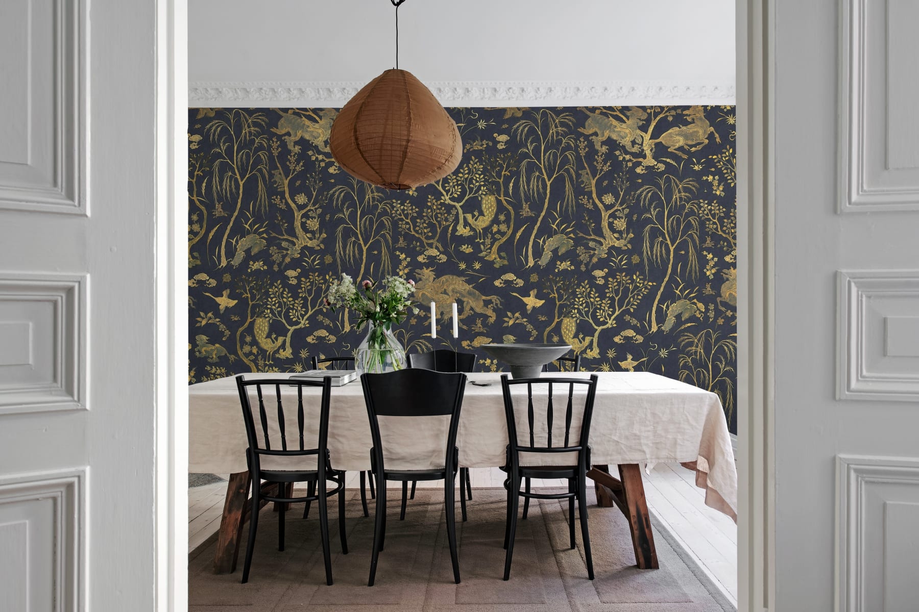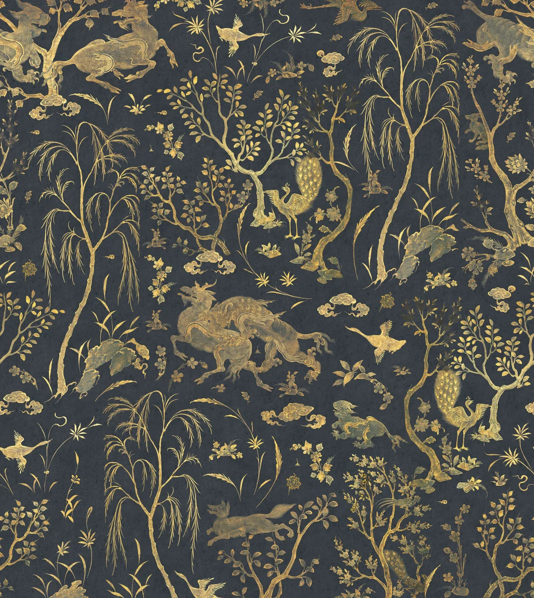 Pășește-te într-un tărâm al încântării cu tapetul Dragon Garden, Gold. Aduce la viață o combinație de creaturi mitice cu eleganța naturii, prezentând ilustrații uimitoare ale dragonilor maiestuoși, păsărilor grațioase și copacilor complicati.