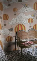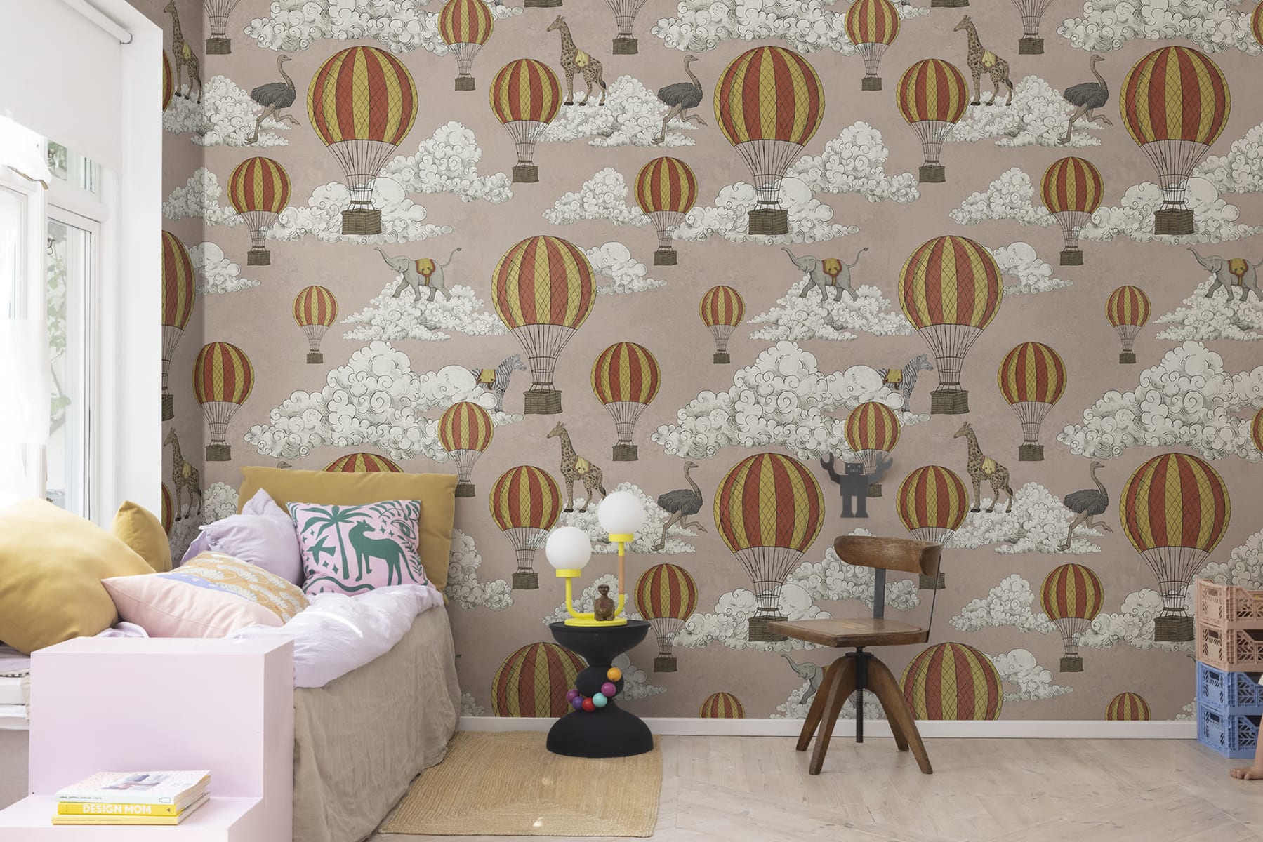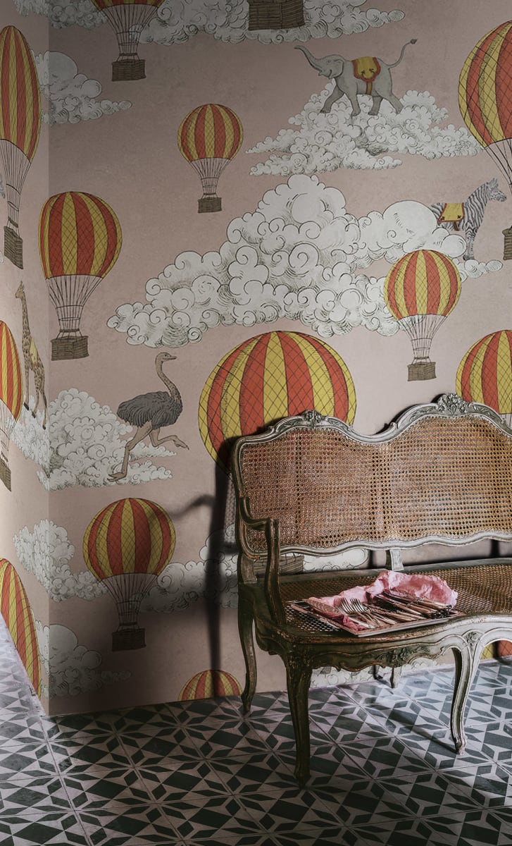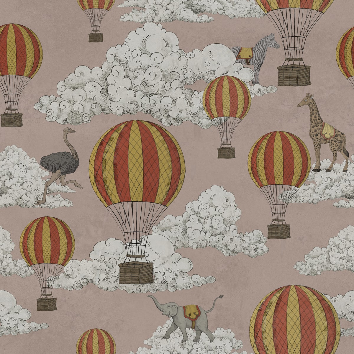 Un model colorat și jucăuș al pictorului și designerului de interior Jack Kinsey. Animale sălbatice drăguțe, nori pufoși și baloane cu aer cald! Tot ce iti poti dori! Adorabil și ciudat, ideal în camera unui copil. Culoarea Dusty Pink are un fundal roz pudrat și baloane galbene și roșii.