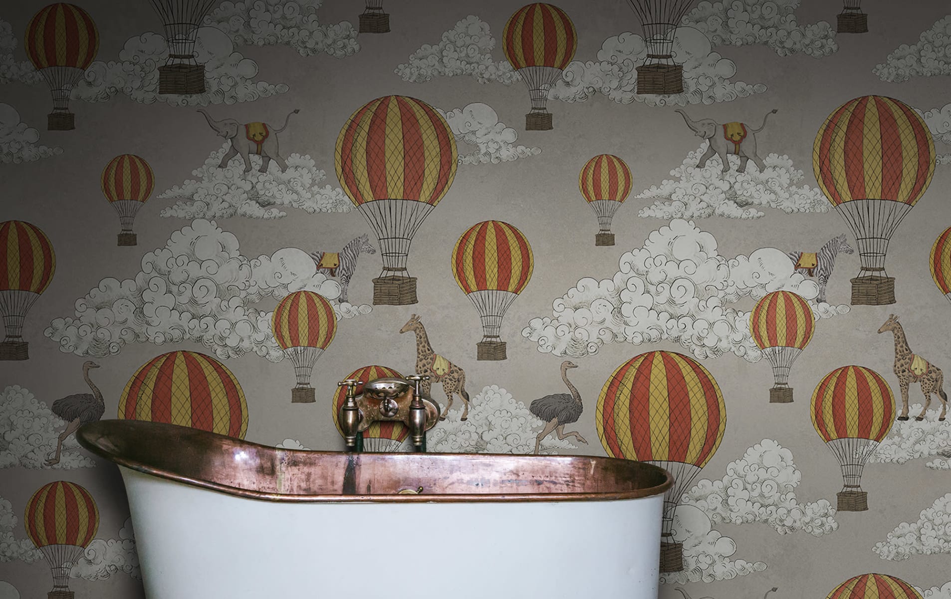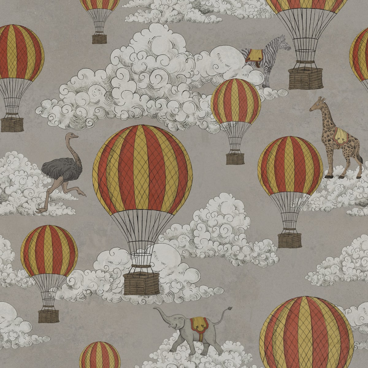 Un model colorat și jucăuș al pictorului și designerului de interior Jack Kinsey. Animale sălbatice drăguțe, nori pufoși și baloane cu aer cald! Tot ce iti poti dori! Adorabil și ciudat, ideal în camera unui copil. Nuanța de culori Greige are un fundal gri-bej moale, plăcut și baloane galbene și roșii.