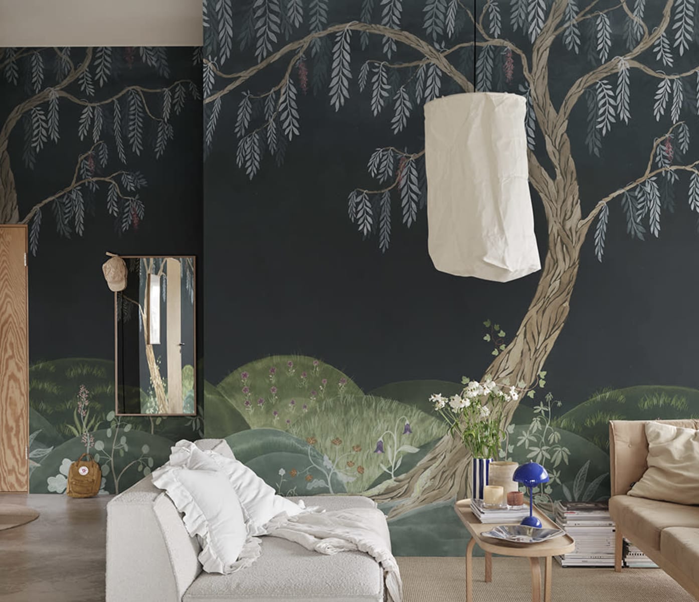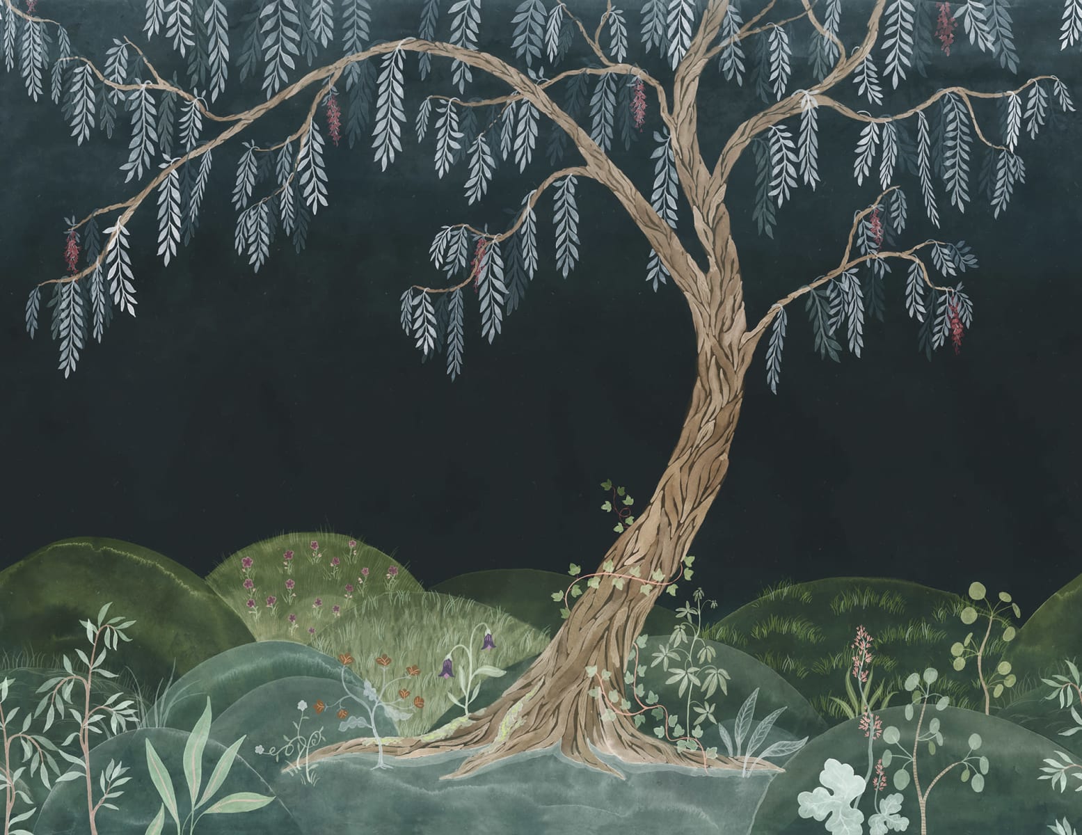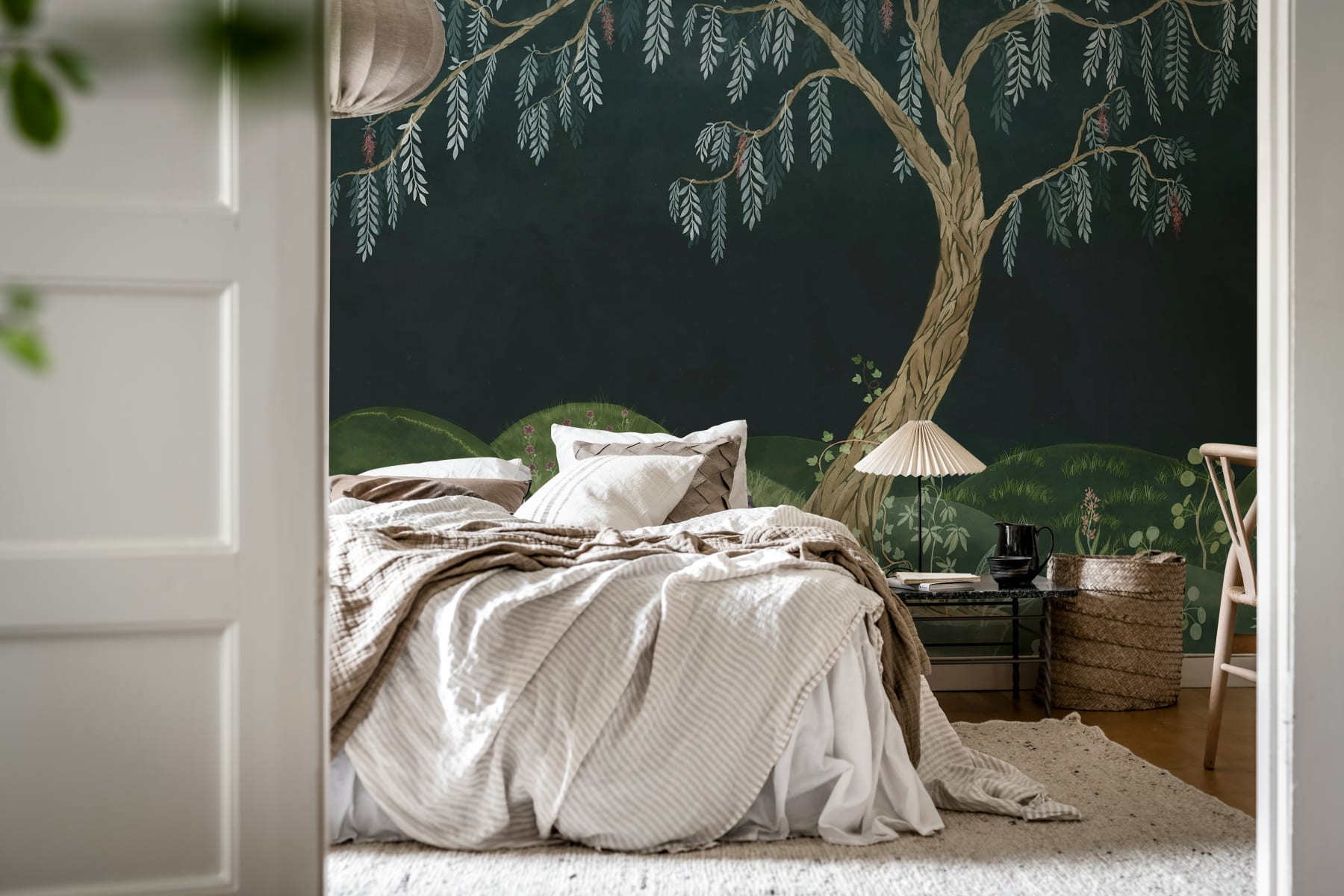 Lucrare de artă cu copaci de vis pentru pereții dvs. Acest design oferă familiei dvs. un baldachin de protecție uimitor și ascunzătoarea perfectă pentru jocuri creative sau lectură. Culoarea Midnight creează o atmosferă magică cu o bază întunecată dramatică, un model în verde, albastru și maro atrăgător și detalii drăguțe în roz și liliac.