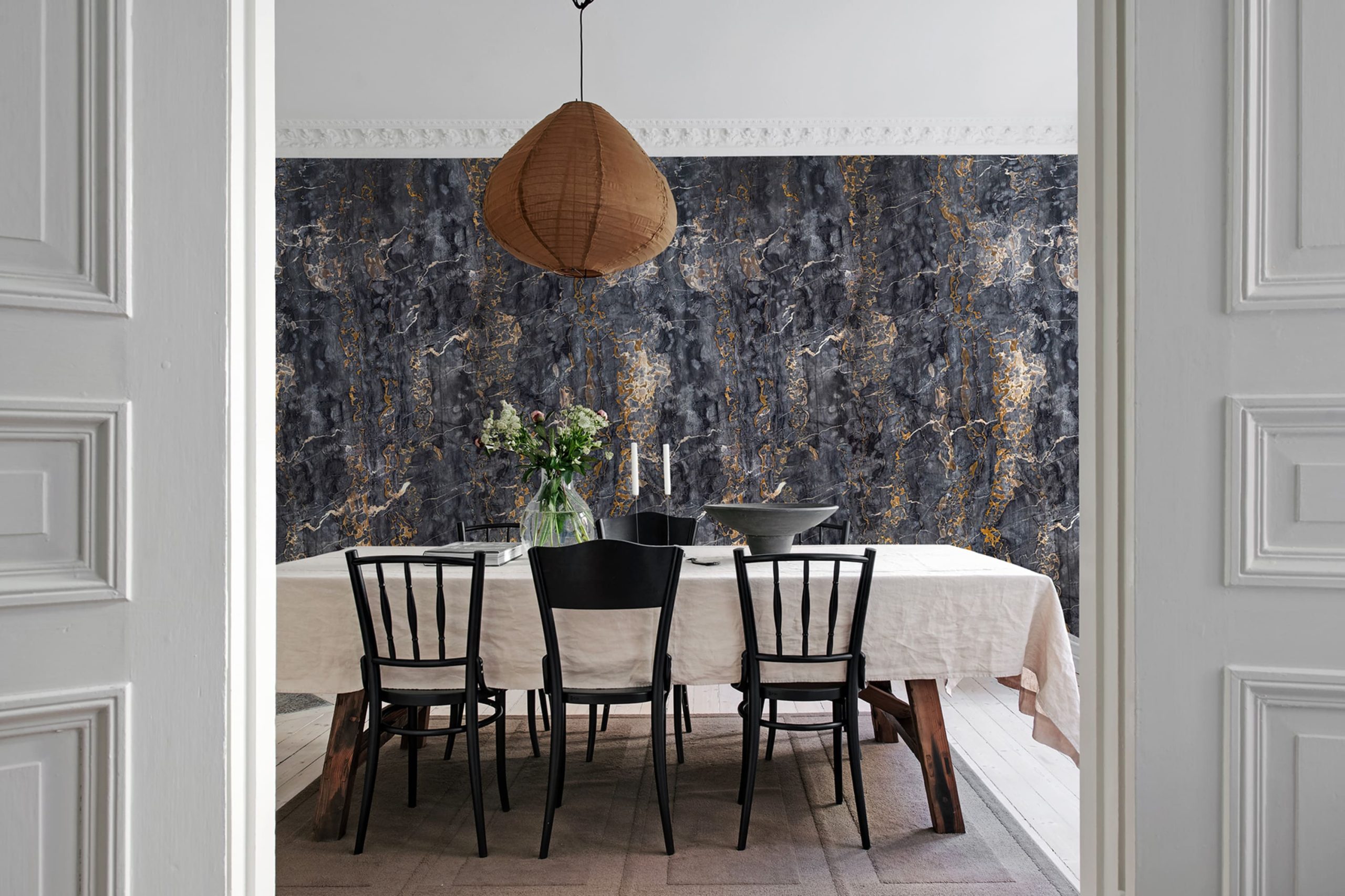 Piatra neagră cu detalii aurii dă o senzație de lux.