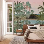 Adaugă o notă exotică și vibrantă spațiului tău cu acest tapet cu un model tropical. Designul prezintă macarale elegante, palmieri