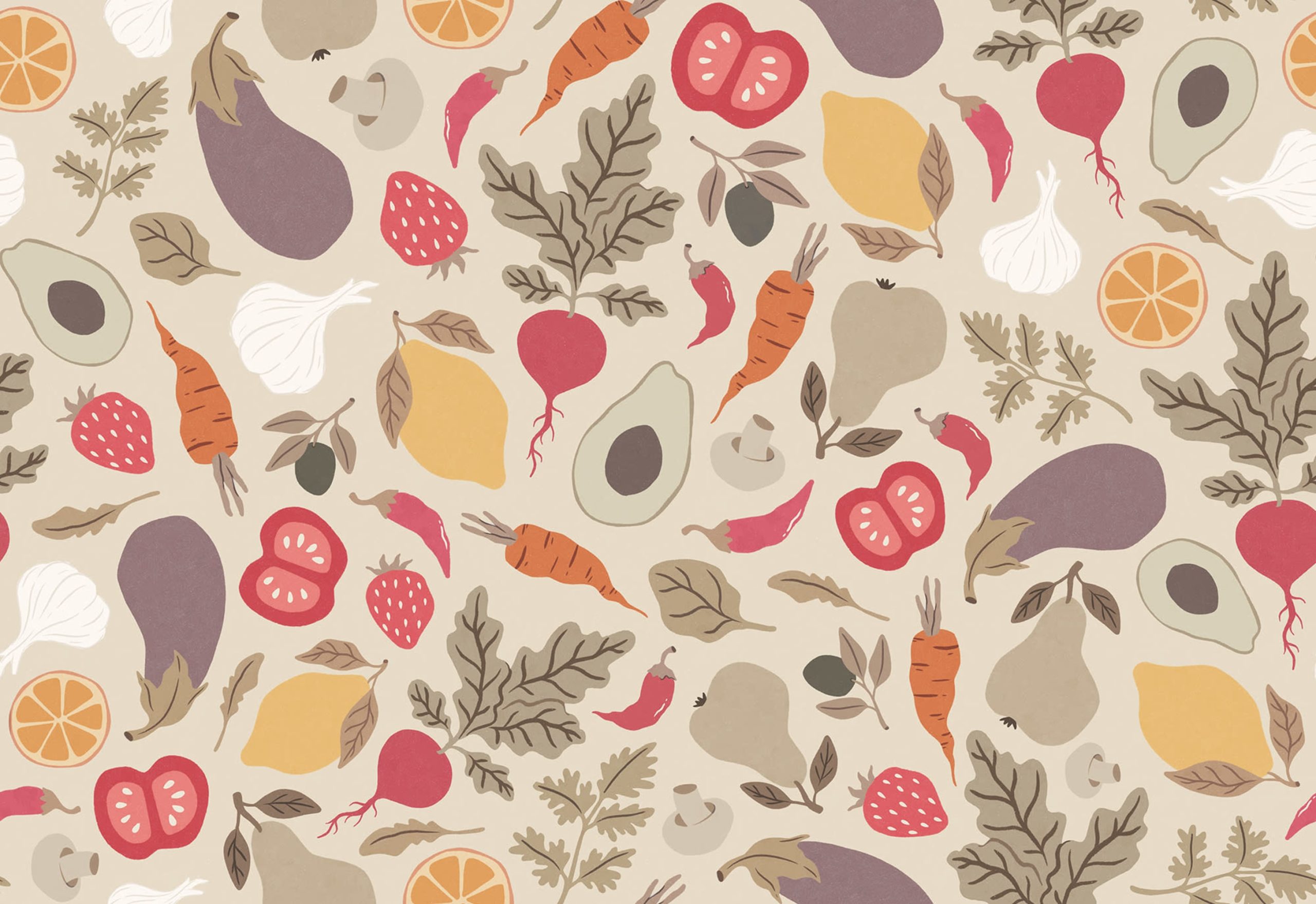 Un design prietenos, dar plin de stil, care îți amintește să îți mănânci legumele! Acest design încrezător este desenat de mână și are o textură deosebită, cu pete. Se potrivește perfect într-o bucătărie! Varianta de culoare Sand are un fundal de culoare bej și legume gustoase în galben, portocaliu, roșu și maro.