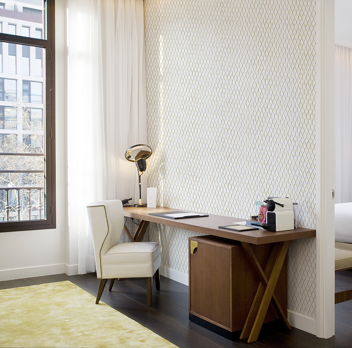 Brave Partiture, Kraft, din colecția L’Enfant Terrible, este un design geometric, în nuanțe de bej/nud. Reinterpretare îndrăzneață a unei partituri
