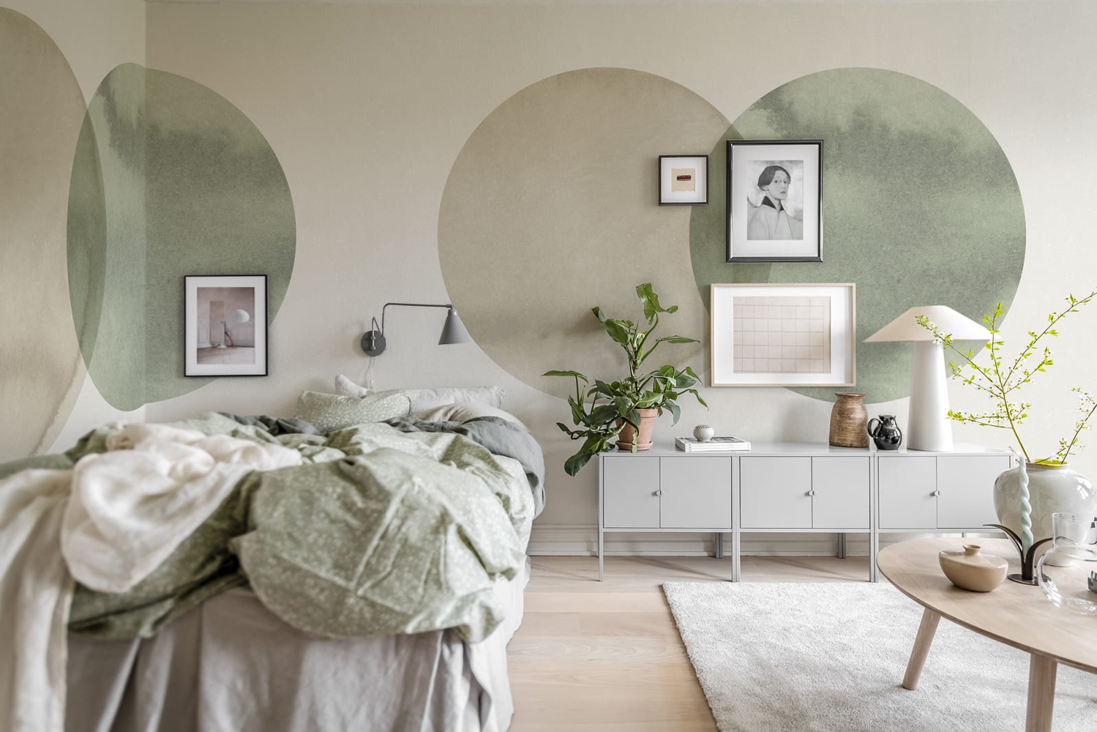 Acest tapet aduce o notă artistică subtilă în orice cameră. Cercurile suprapuse în nuanțe de bej și verde creează un efect vizual calmant și sofisticat. Perfect pentru dormitor sau living!