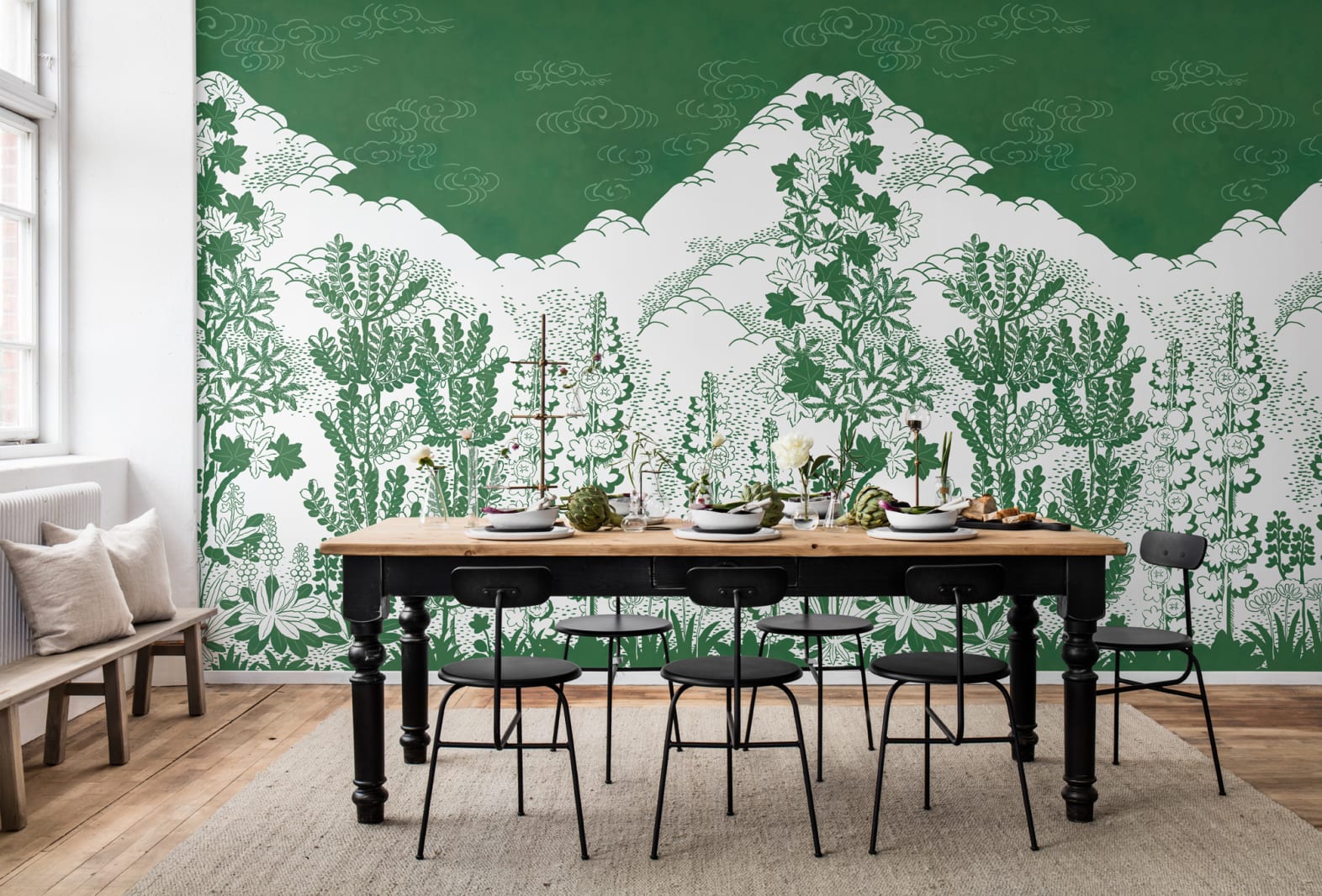 Acest model de fototapet pictat de mână este minunat pe un singur perete – la fel de minunat și de extravagant va fi și pe toți cei 4 pereți, creând un întreg lanț montan. Poți avea și tu interpretarea Naïve a unui peisaj montan.