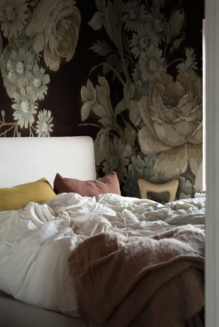 Efraim, cu fundalul său negru închis în culoarea Night, adaugă profunzime unei camere. Nuanțele dulci ale florii, în bej, greige și verde pastel, fac cu adevărat să apară. De ce nu în dormitor?