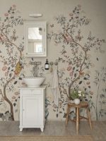 O capodoperă chinoiserie pictată manual, Eleonora, Misty Blue aduce o senzație delicată și aerisită. Vițele de vie florale și păsările în roz cald, verde intens și albastru moale se sprijină pe un fundal bej cald.