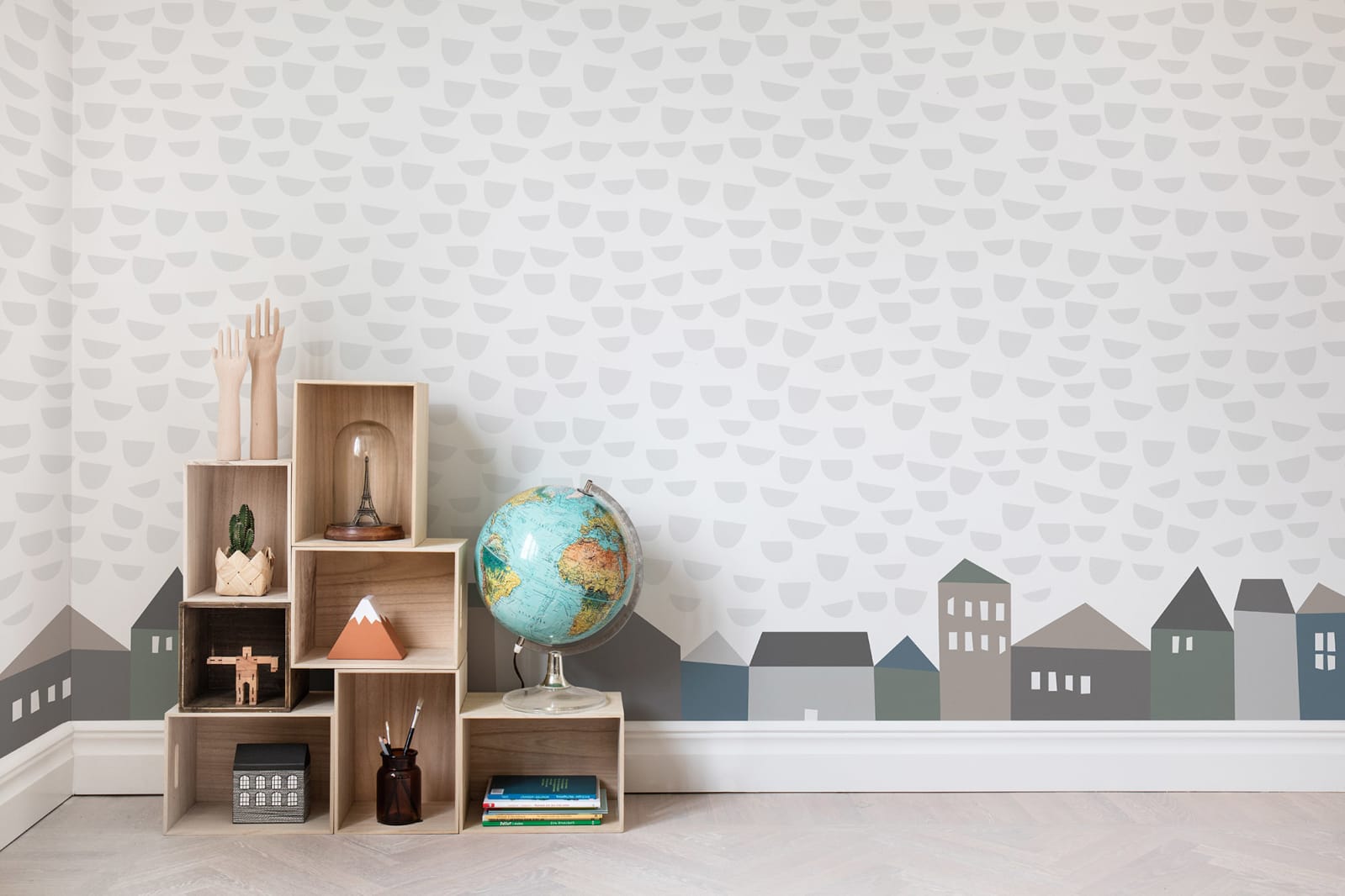 Picăturile de ploaie au un efect relaxant – cel puțin atunci când ești confortabil la tine acasă. În acest fototapet, vei găsi cerul deasupra orașului, printat cu o sugestie de picături de ploaie, care sunt modelate pe urme de elefant. Acest design subtil, repetat pe margini este perfect pentru a fi folosit în întreaga cameră.