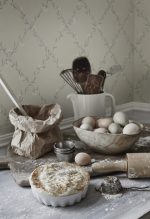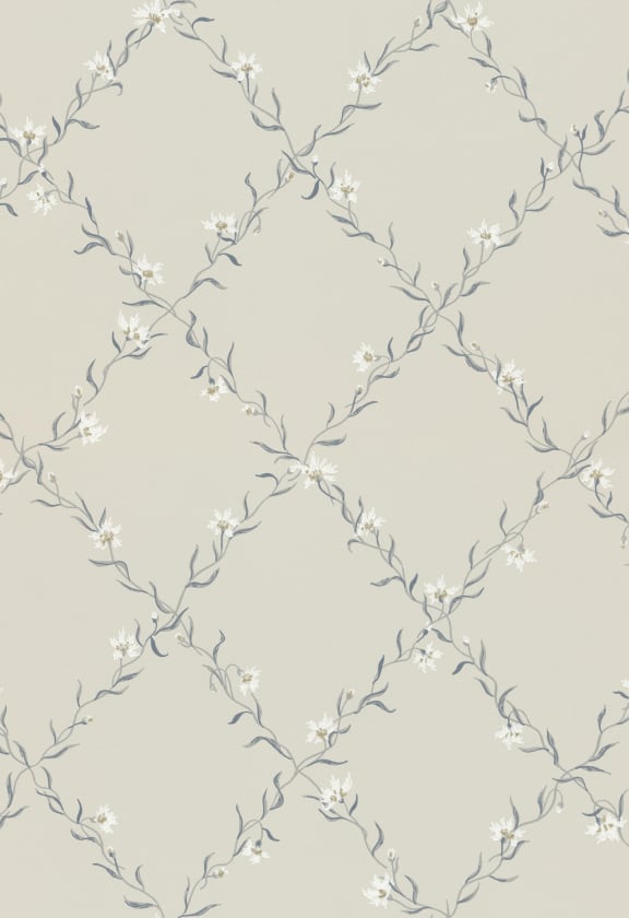 Ewa grey este un tapet cu ghirlande de albăstrea grațioase pictate de mână. Albăstreaua a fost o floare decorativă foarte apreciată în epoca gustaviană. Trăsăturile modelului amintesc de porțelanul alb și albastru importat de East India Company.