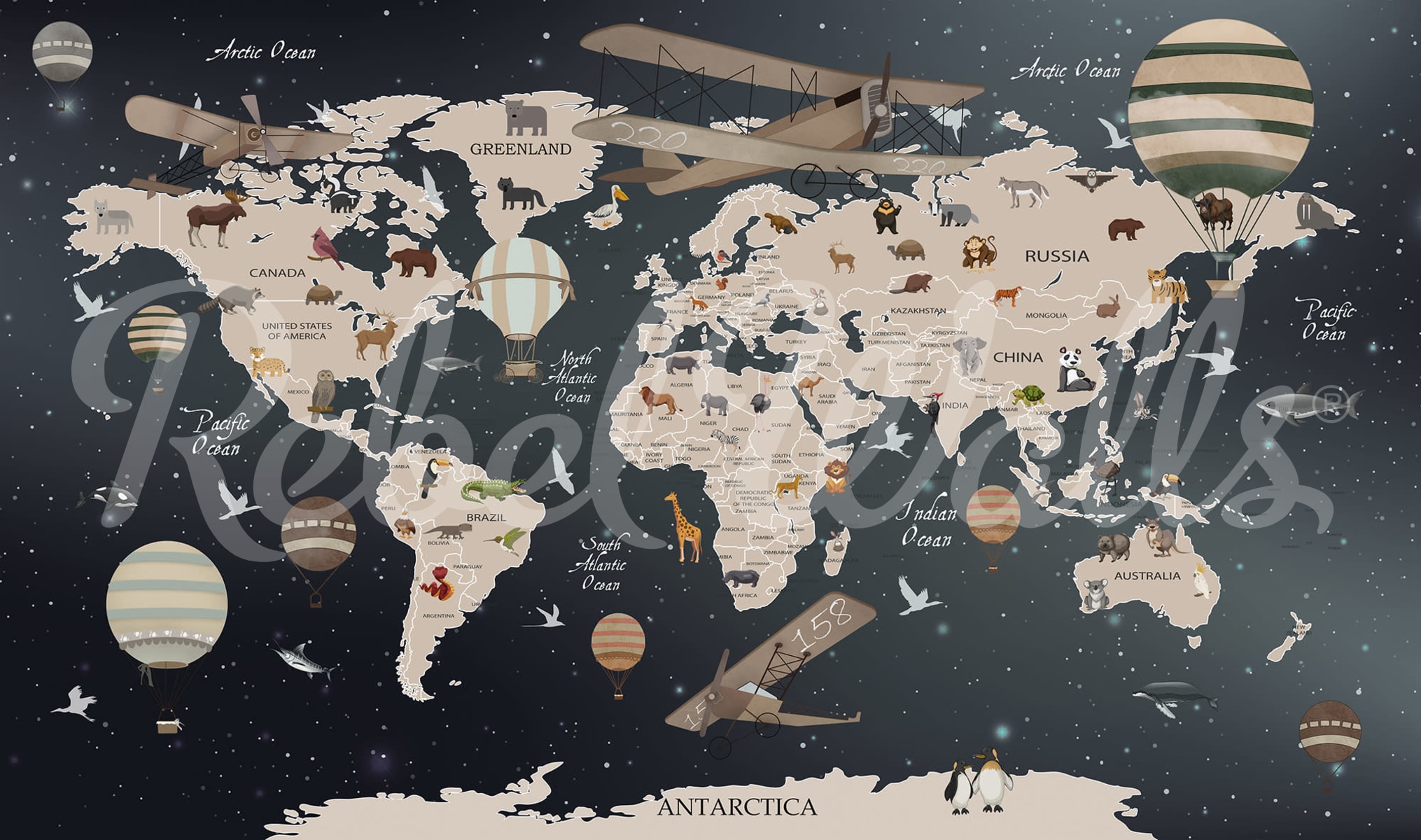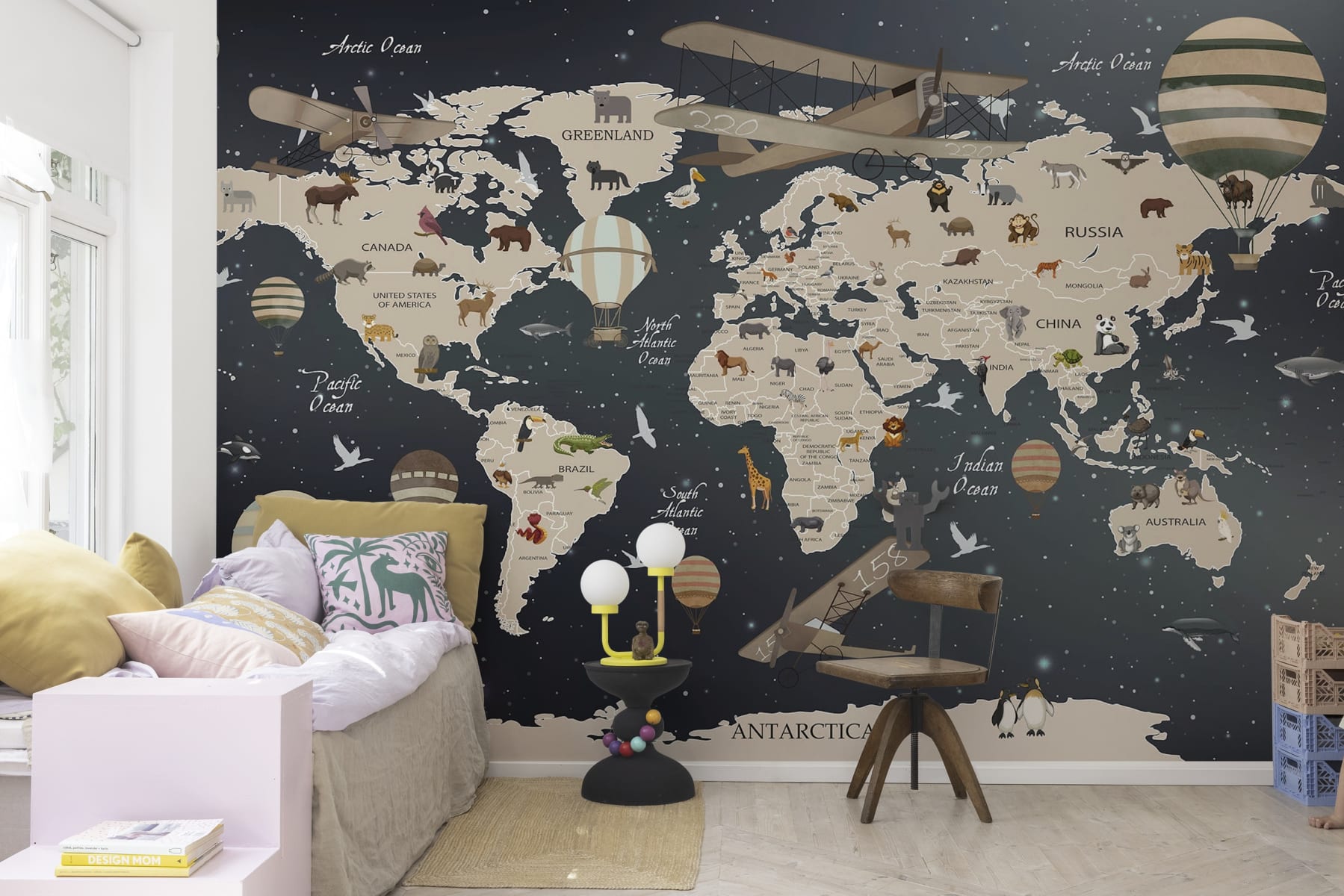 Transformă camera copilului tău într-un spațiu captivant și educativ cu imaginile extraordinare din modelul Explorer Map. Aceasta duce copilul într-o călătorie captivantă prin regatul animalelor, combinând atracția aventurii cu bucuria de a învăța. Dispunând de o hartă a lumii frumos ilustrată, împodobită cu personaje animale fermecătoare și vibrante, acest tapet creează un mediu captivant pentru micuțul tău.