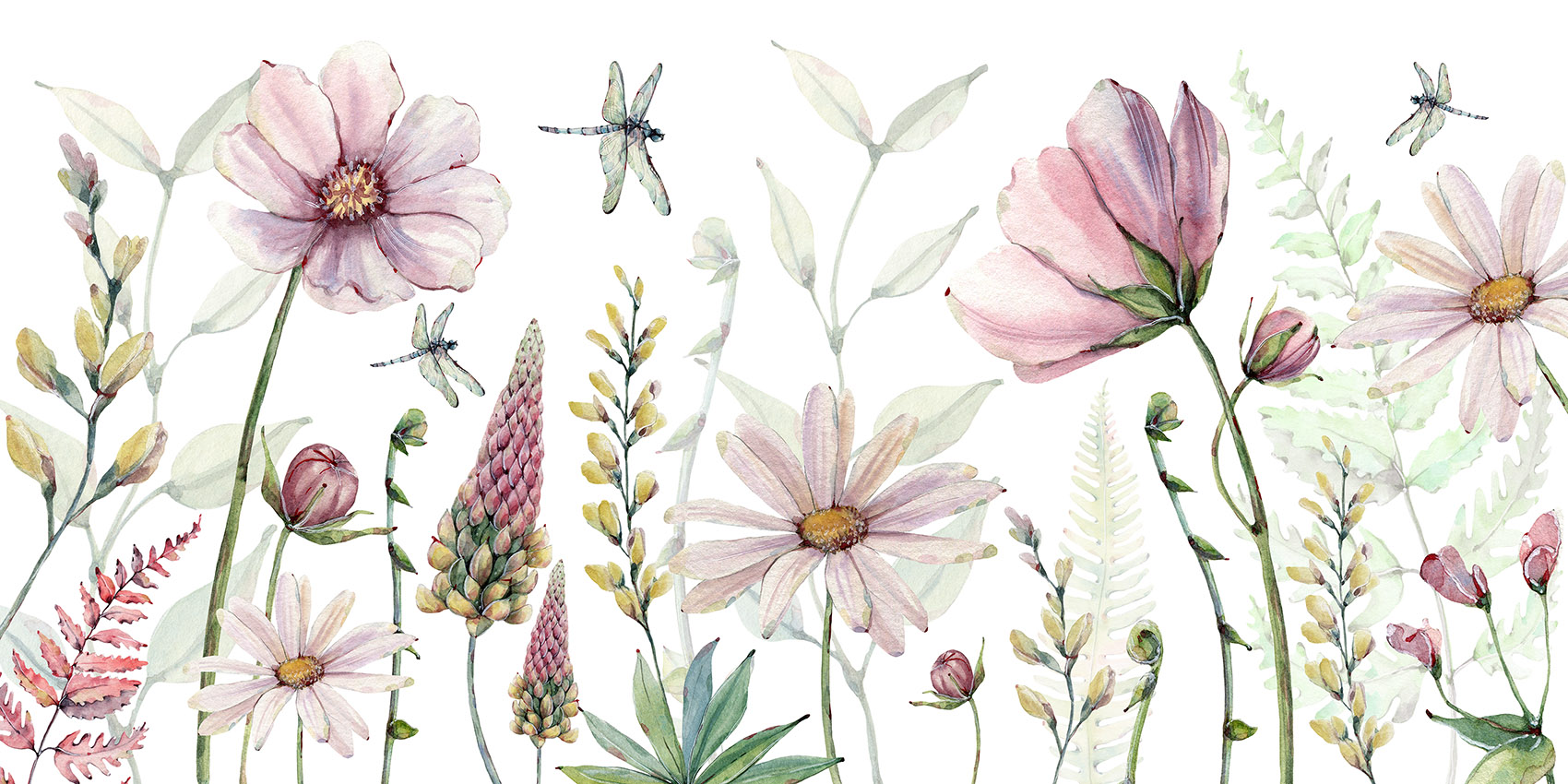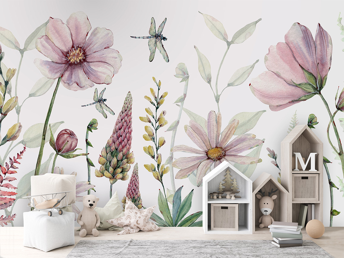 Acest model de flori delicate și libelule, pictate cu acuarele, aduce o notă de prospețime și eleganță oricărei încăperi. Culorile pastelate și detaliile fine creează o atmosferă caldă și primitoare, perfectă pentru dormitoare, livinguri sau spații de joacă. Imaginea este realizată cu detalii realiste, care oferă impresia de profunzime și realism.