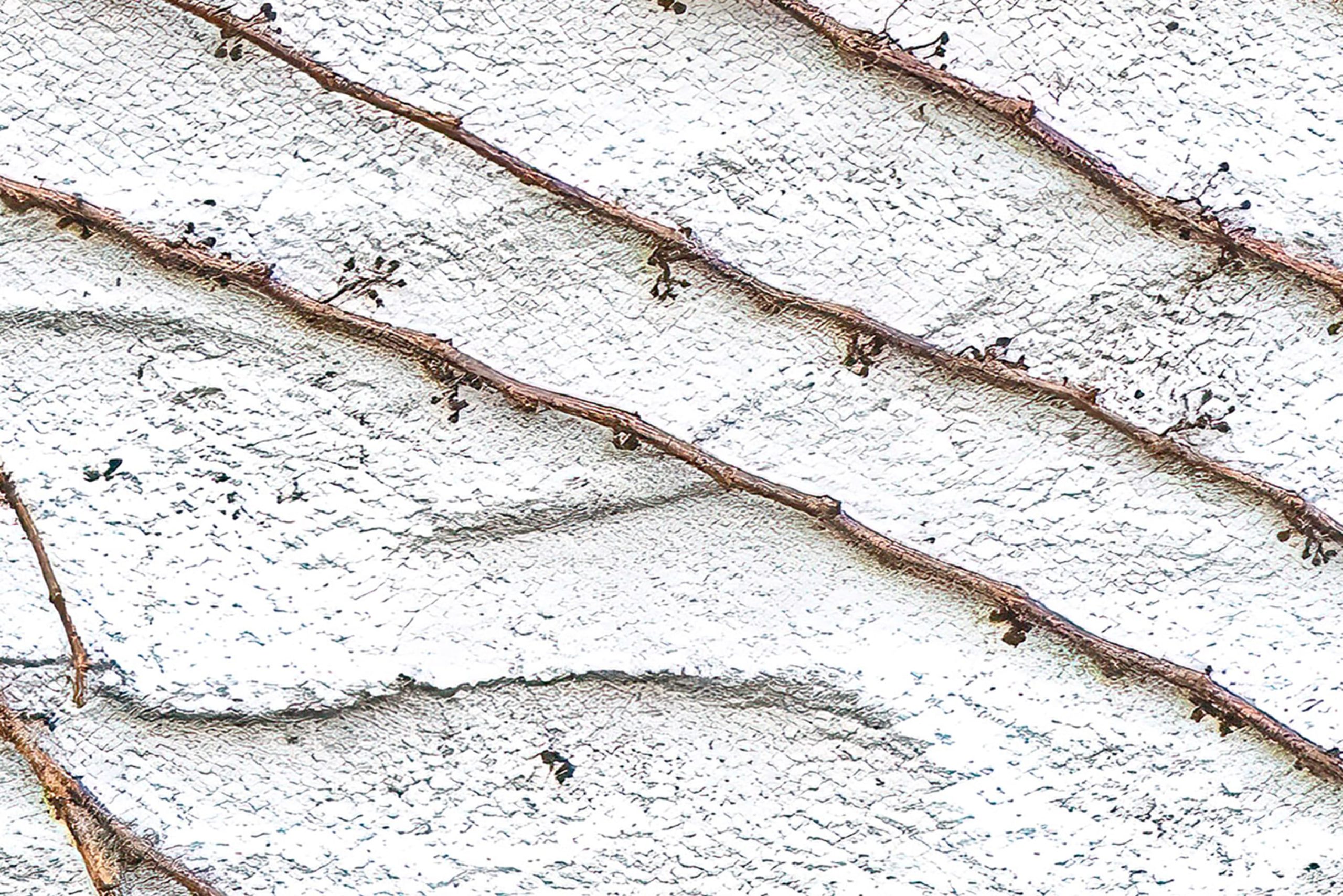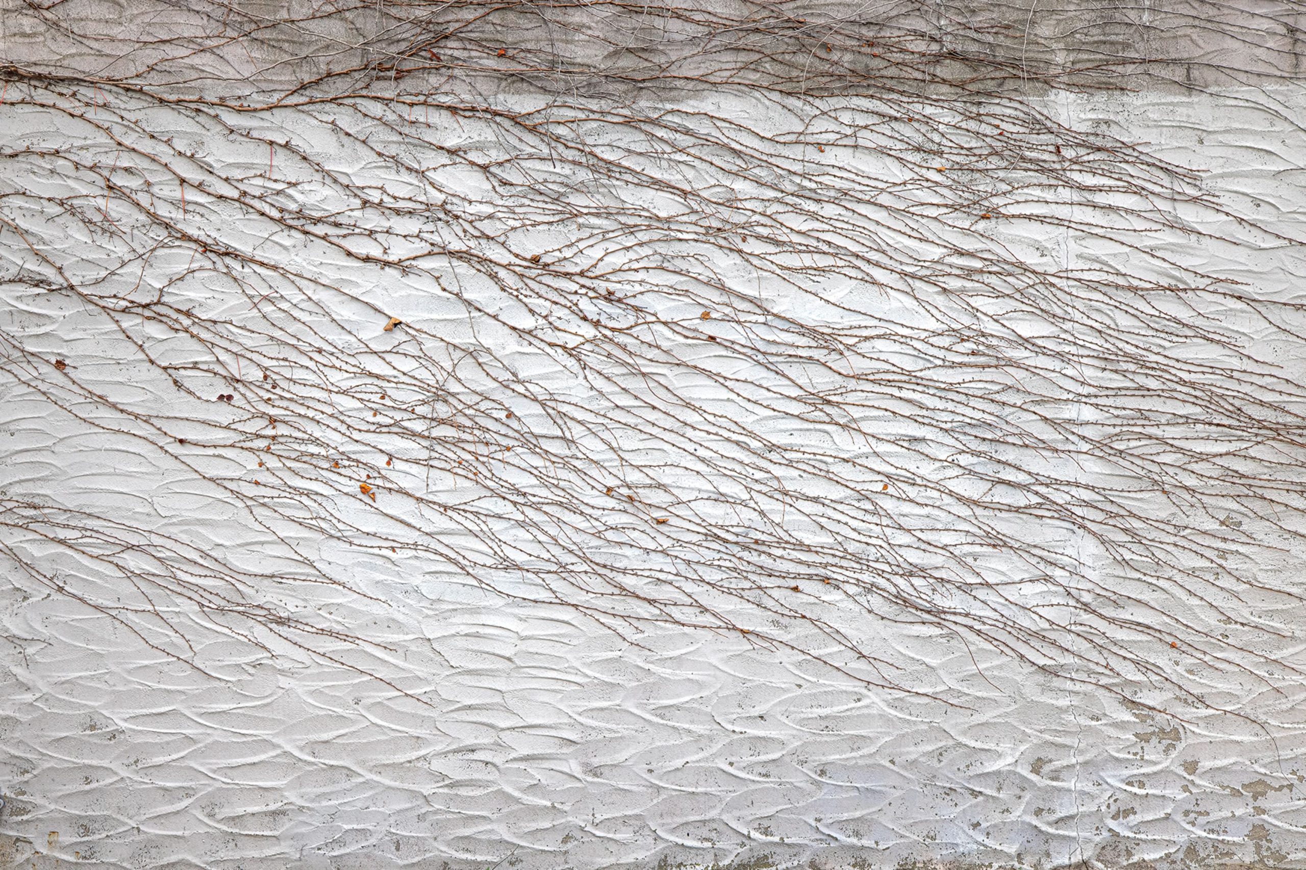 Crengi cățărătoare pe o fațadă de piatră ușoară.