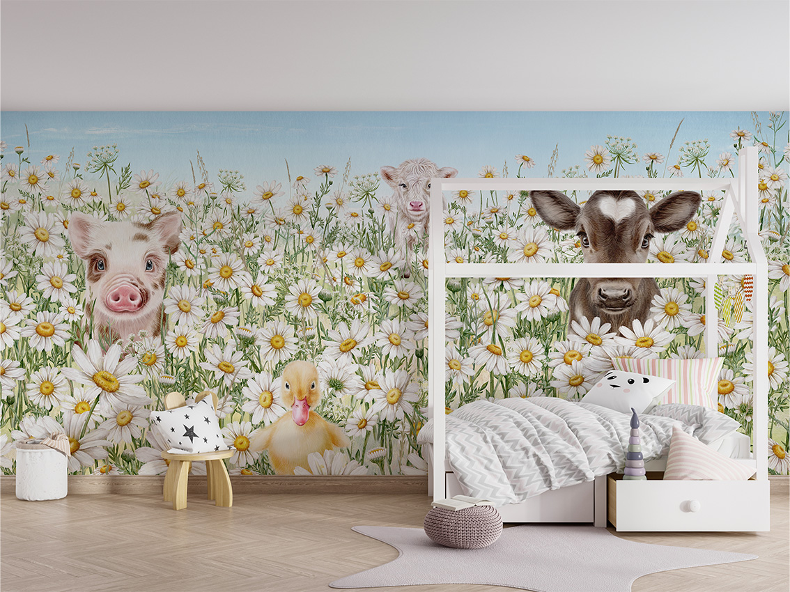 Acest tapet personalizat vă va transforma camera într-o oază de liniște și frumusețe naturală. Imaginea cu animale drăguțe într-o pădure de margarete, vă va crea o atmosferă de vis în camera dumneavoastră.
