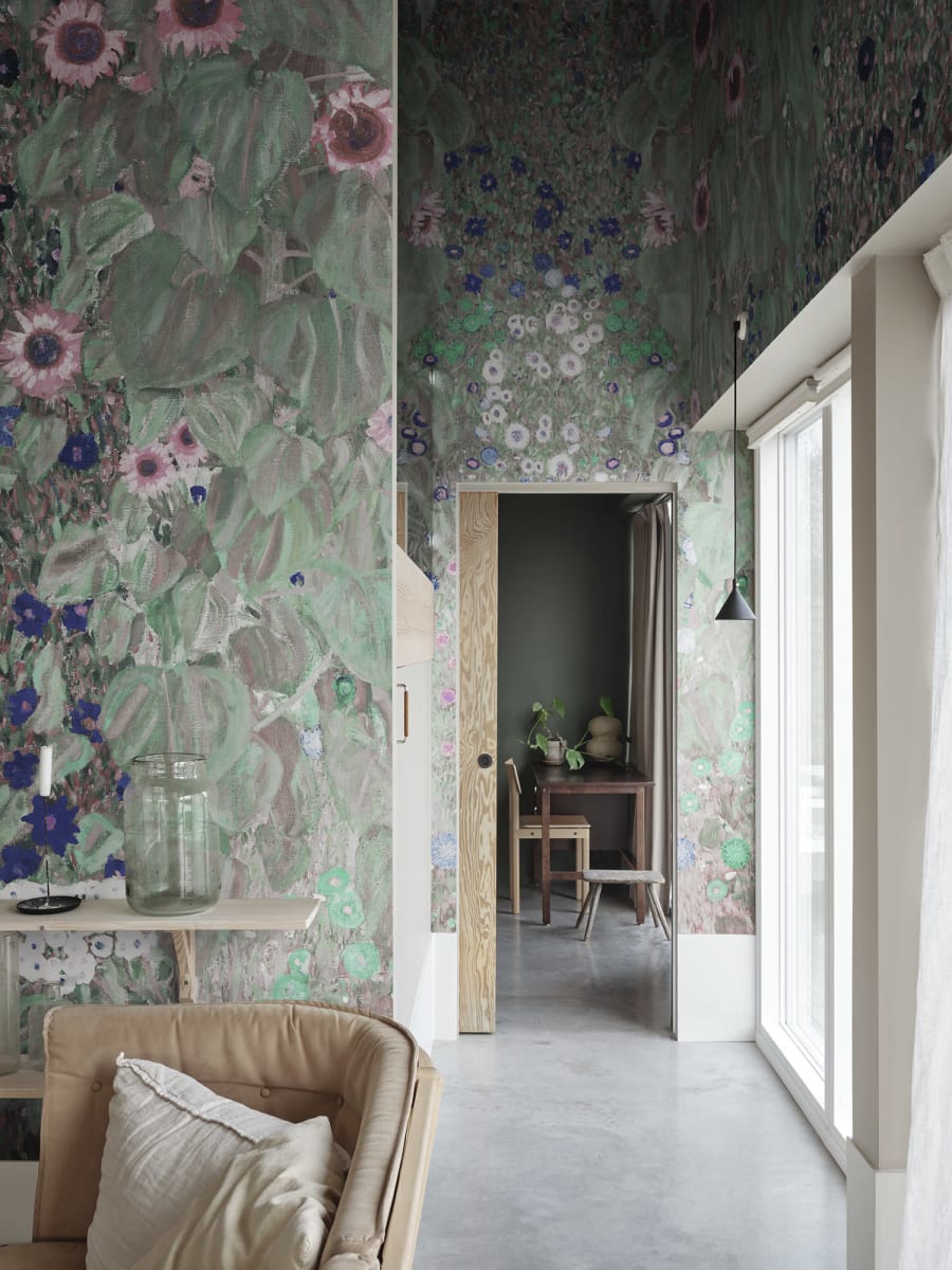 Farm Garden, Soft, este o nouă versiune extraordinară de tapet a celebrei opere de artă Farm Garden a lui Gustav Klimt. Designul este un model floral abundent care îmbrățișează grațios spațiul dvs. Culoarea Soft vine în nuanțe frumoase de verde, roz, albastru și alb.