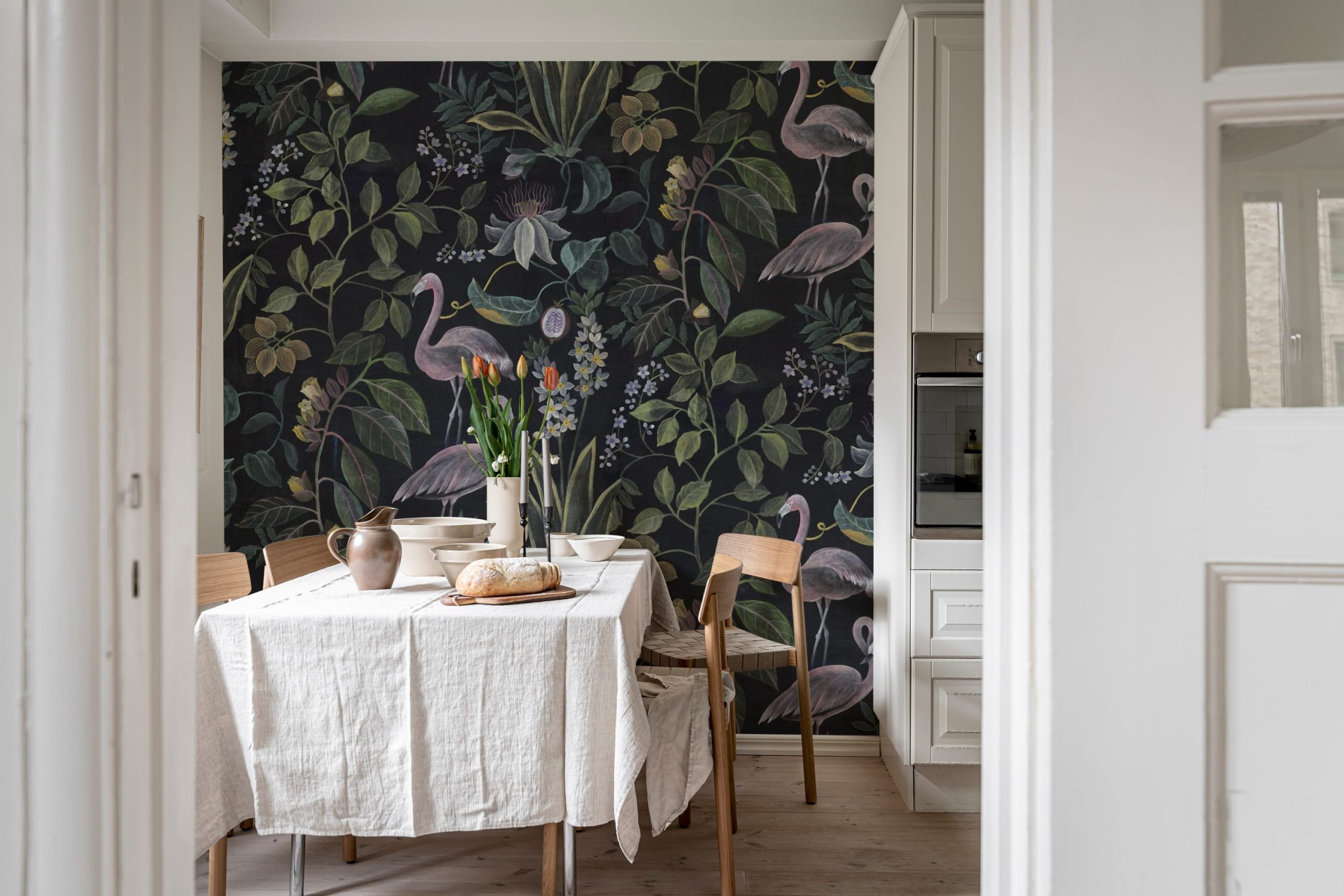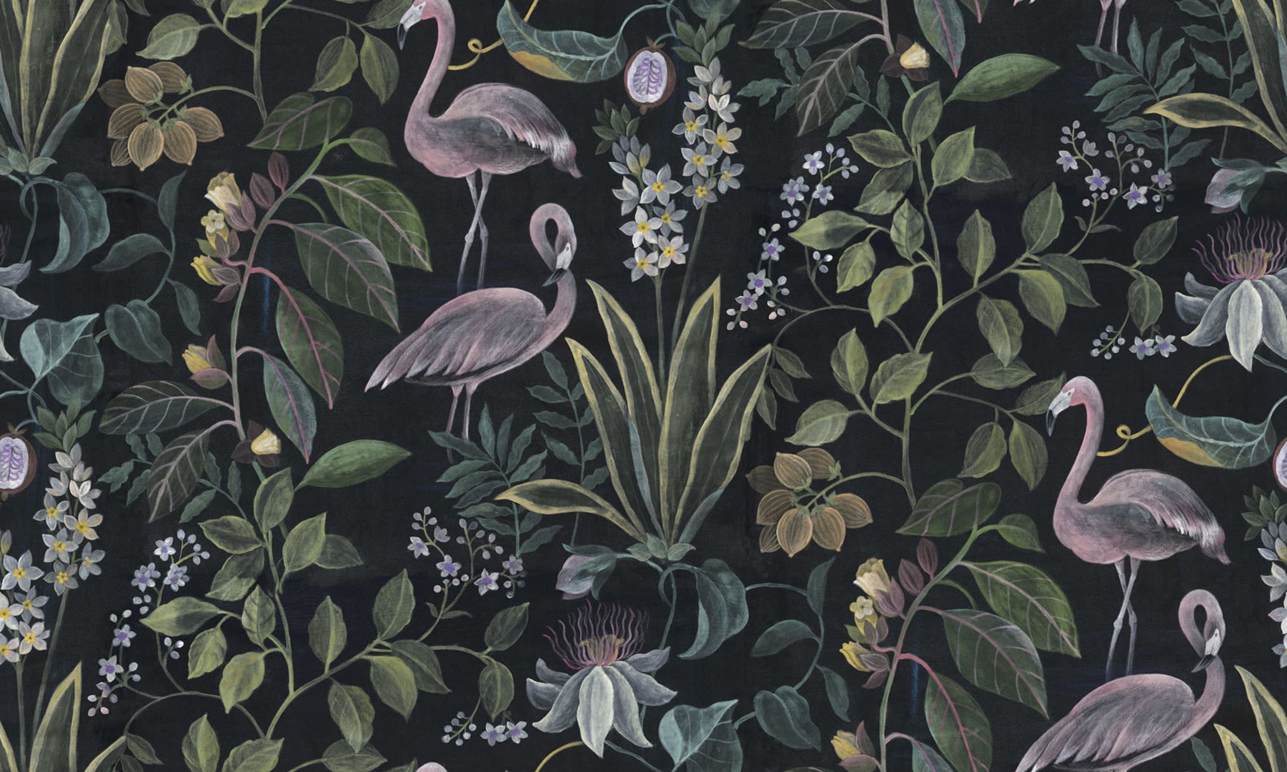 Scufundați-vă în frumusețea exotică a lui Flamingo Paradise, Midnight. Acest tapet prezintă păsări flamingo elegante, înconjurate de frunze și flori bogate, toate pe un fundal întunecat și misterios, perfect pentru a crea o oază tropicală îndrăzneață și vibrantă în spațiul dumneavoastră.