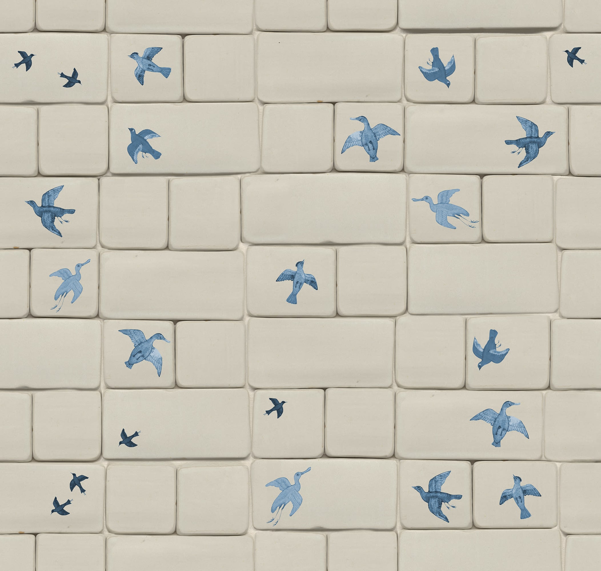 Plăcile făcute manual conferă acestui tapet fermecător o aparență și o senzație autentică, evidențiind frumusețea în imperfecțiune. Varianta Blue are un fundal bej sofisticat îmbogățit cu păsări albastre surprinse în zbor.