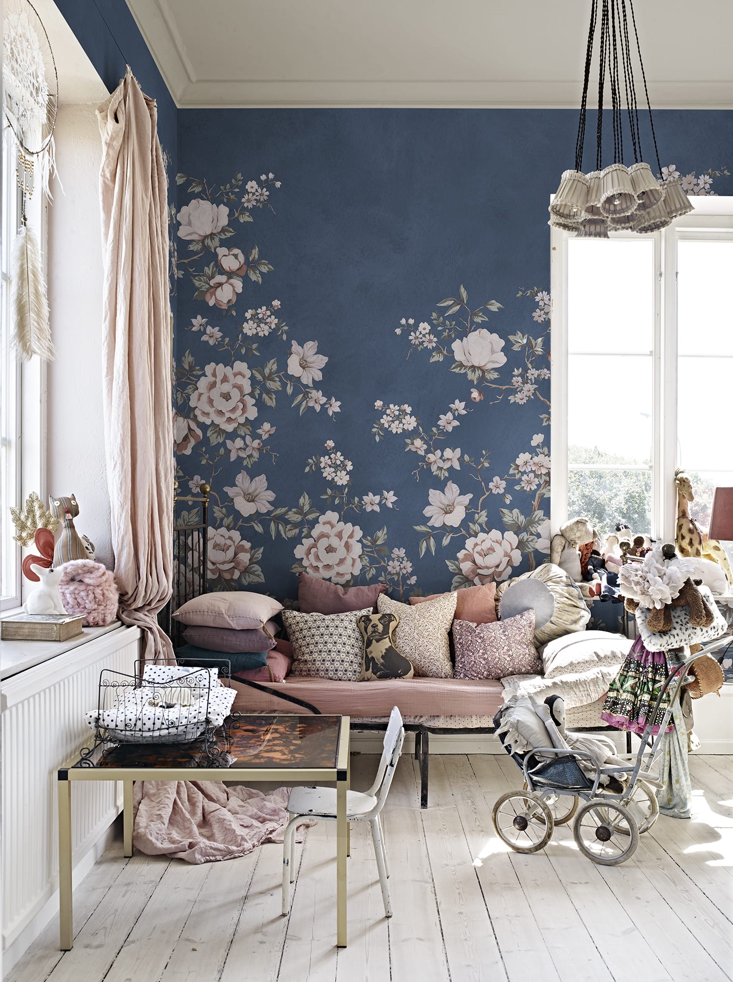 Tapetul încântător, Floral Chinoiserie, se inspiră dintr-o pictură originală de epocă. Ramuri delicate înfloresc cu trandafiri și detalii florale complicate, așezate pe un fundal senin, dar plin de viață. Perfect pentru a crea o atmosferă elegantă cu o aluzie la arta clasică. Culoarea Dark Blue are un model roz, maro și verde salvie pe o bază albastră.