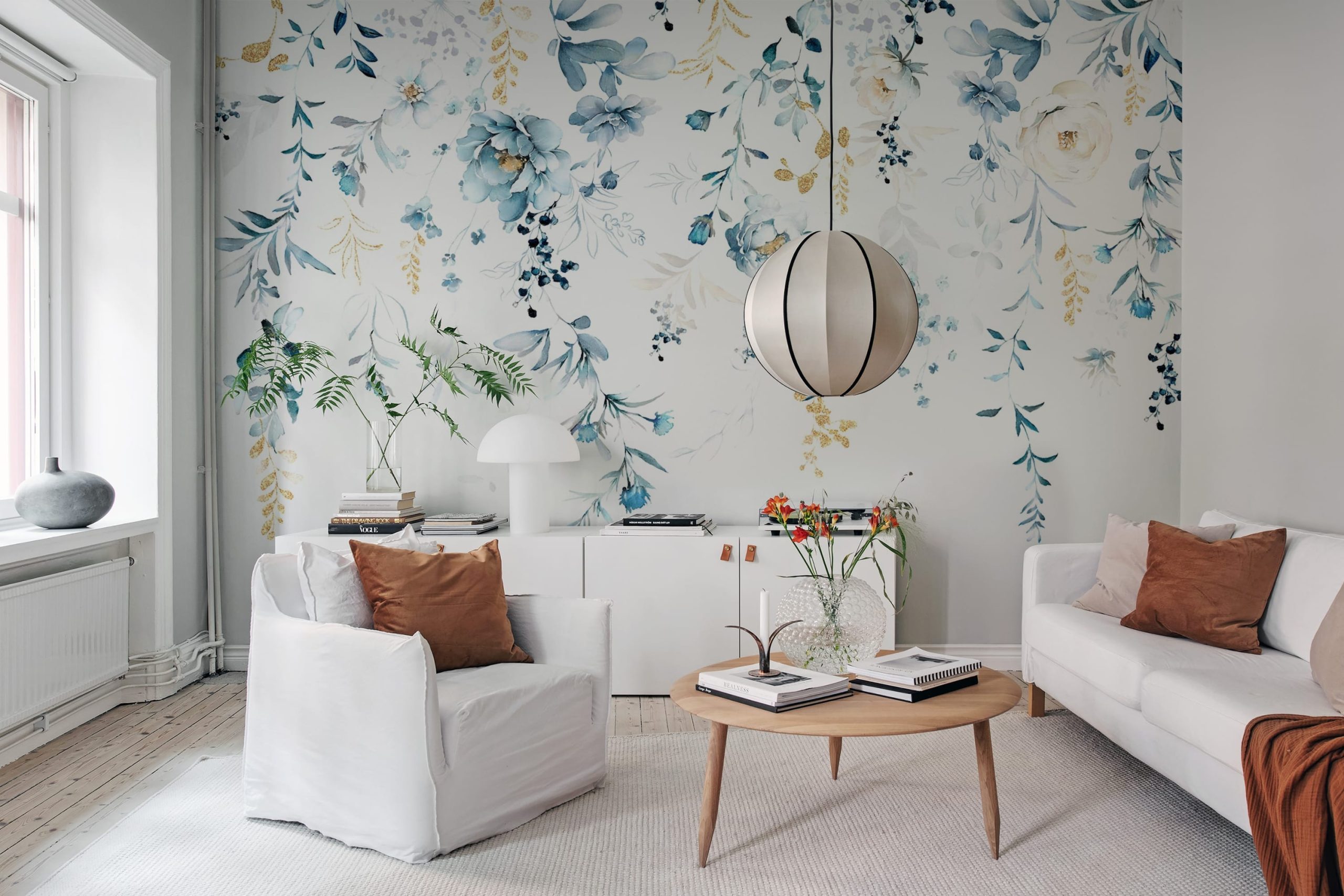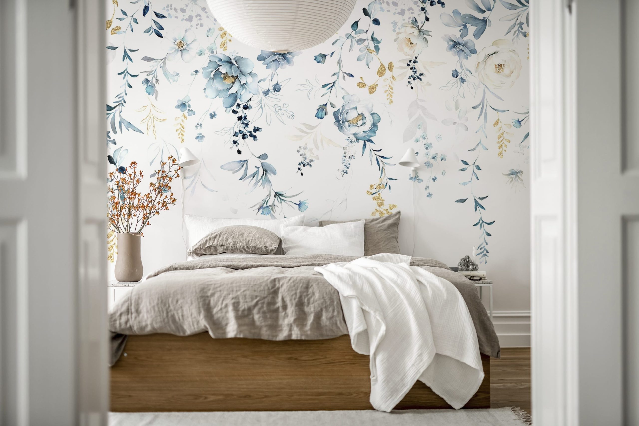 Aduceți frumusețea naturii în interior cu tapetul Floral Drape. Acest design captivant prezintă flori și crenguțe delicate care atârnă, punând în valoare bujorii și trandafirii albaștri înfloriți.