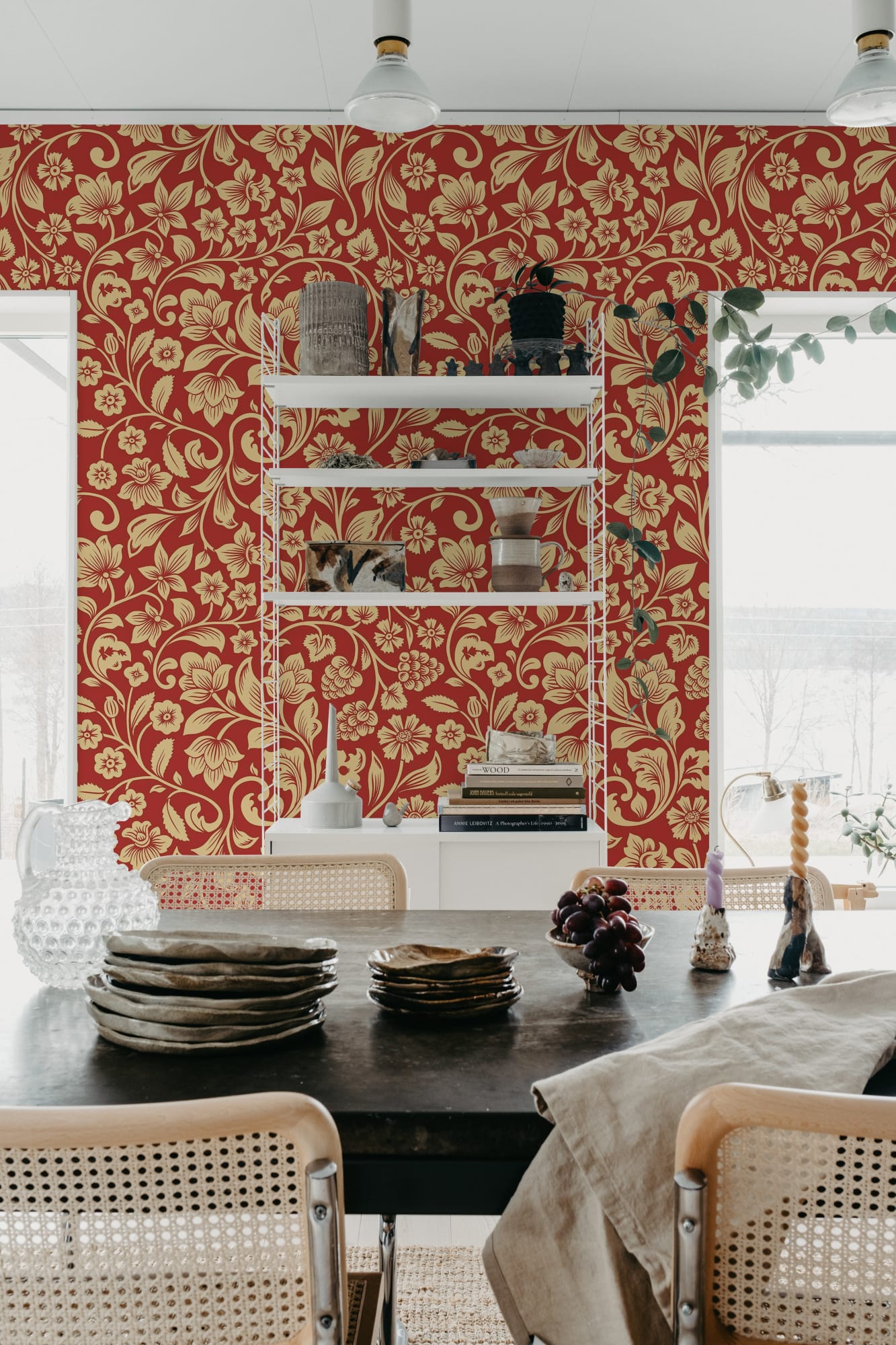 Adaugă o notă de eleganță cu acest tapet floral roșu. Designul sofisticat și culorile vibrante vor revitaliza orice cameră.
