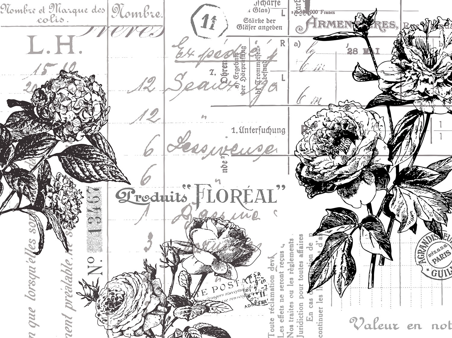 Trandafiri și scrisori. Ce poate fi mai romantic? Schițat parcă în creion, fototapetul Floreal va aduce o atingere vintage, cu un aer boem, oricărei încăperi. Model grafic, floral, în tonuri alb negru.