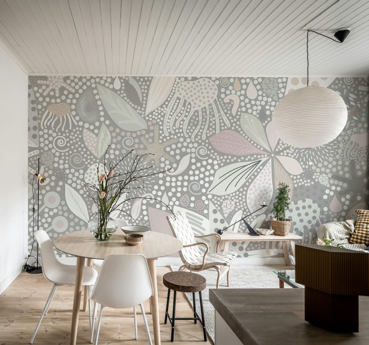 Savurează eleganța subtilă a Flower Art, Pastel. Acest design delicat de tapet relevă un tablou seren cu paleta sa de pasteluri discrete și modele florale abstracte. Griurile moi și rozurile blânde se împletesc cu forme capricioase și texturi punctate, creând o atmosferă pașnică, perfectă pentru orice cameră care caută o notă de sofisticare delicată. Acest tapet este o odă adusă subtilităților artei naturii, oferind o suflare de aer proaspăt și un indiciu al atingerii moi a primăverii. Lasă-ți pereții să prindă viață cu această fuziune grațioasă de frumusețe botanică și artă contemporană.