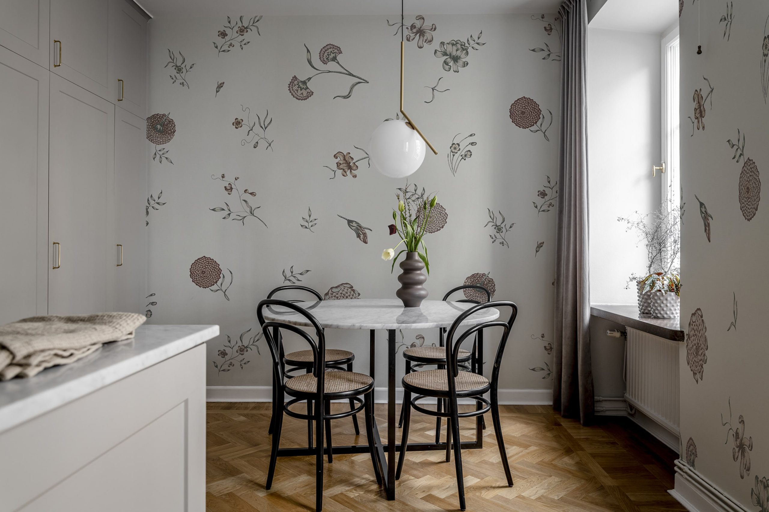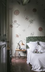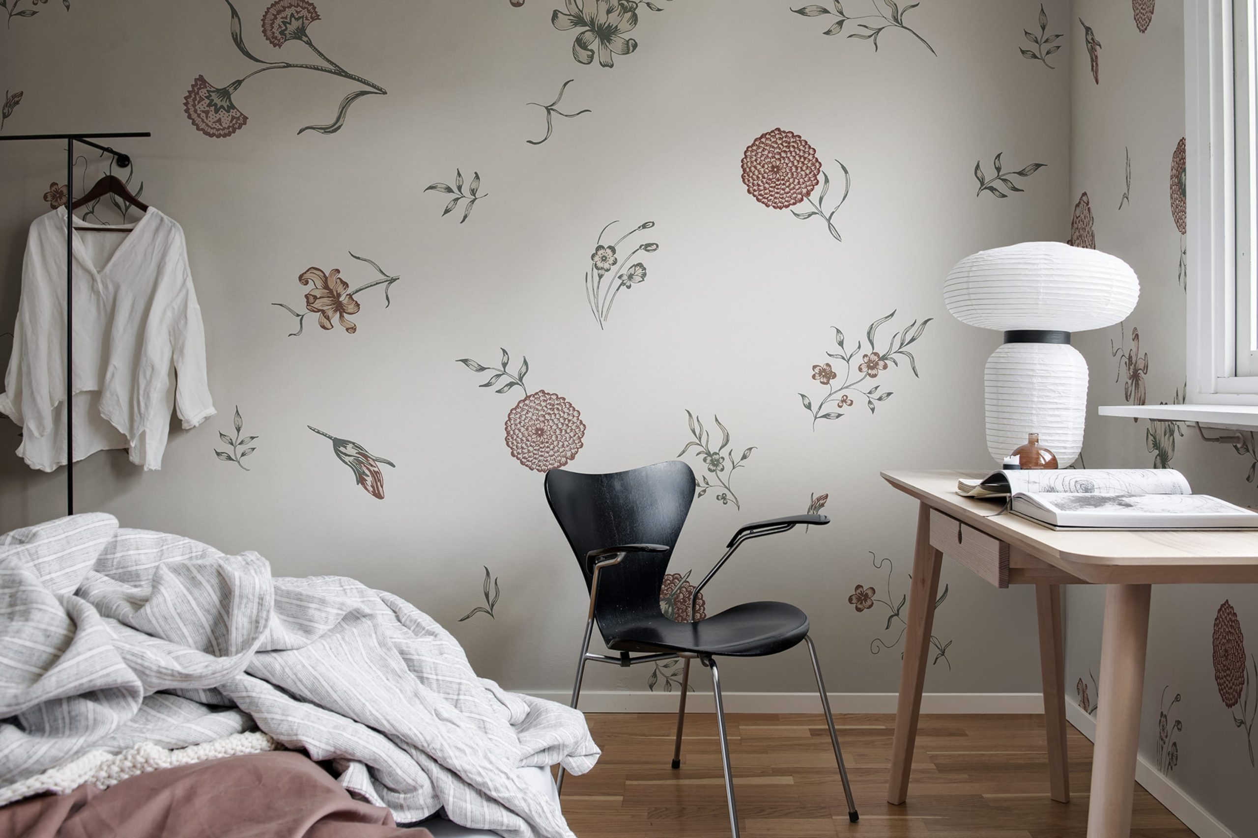 Acest model la scară largă oferă camerei tale o senzație de lumină și aerisire. Florile, frunzele și crenguțele delicate sunt pictate frumos pe un fundal de in. Se potrivește perfect pe toți cei patru pereți. O încântare absolută! Varianta Pearl este strălucitoare, cu detalii gri și roz pudrat.