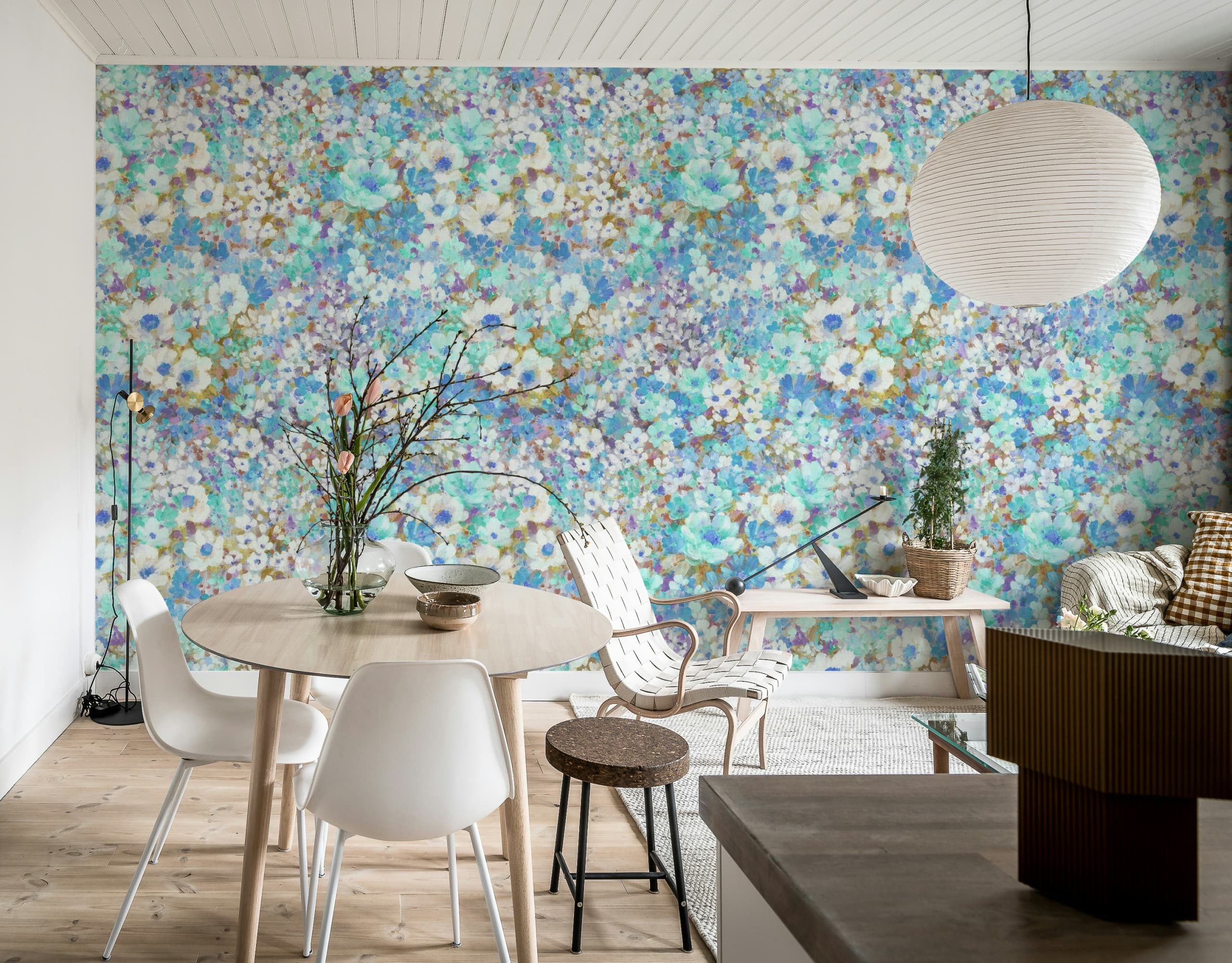 Creează un ambient vibrant cu acest fototapet floral. Tonurile delicate de albastru și violet aduc un plus de prospețime și eleganță oricărui spațiu. Ideal pentru living, dormitor sau birou.