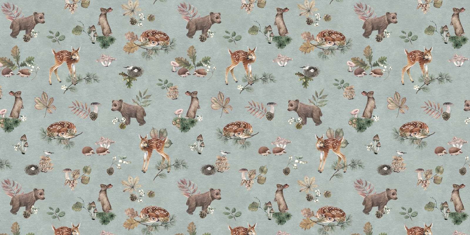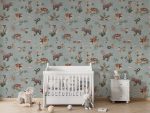 Transformă camera copilului într-o pădure magică! Tapet cu animale sălbatice pe fundal albastru delicat. Creează un spațiu de joacă plin de farmec și imaginație. Ideal pentru camera bebelușului sau a copilului mic.