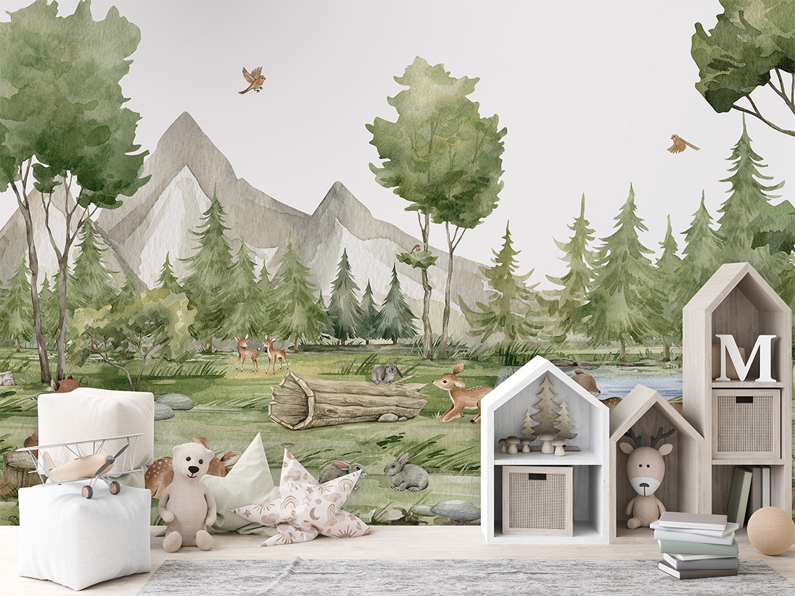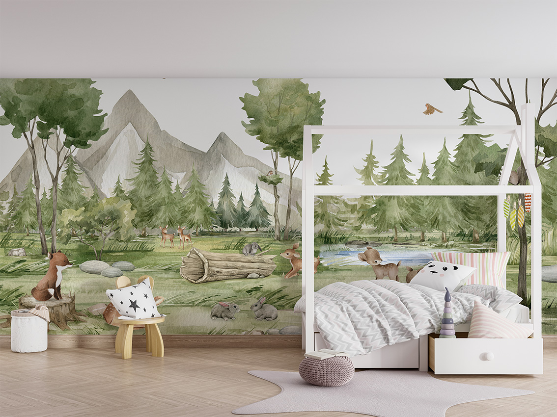 Acest tapet cu o pădure fermecătoare este perfect pentru a adăuga un strop de natură în camera ta. Cu detalii fine ale copacilor, munților și animalelor, tapetul va crea o atmosferă relaxantă și primitoare.