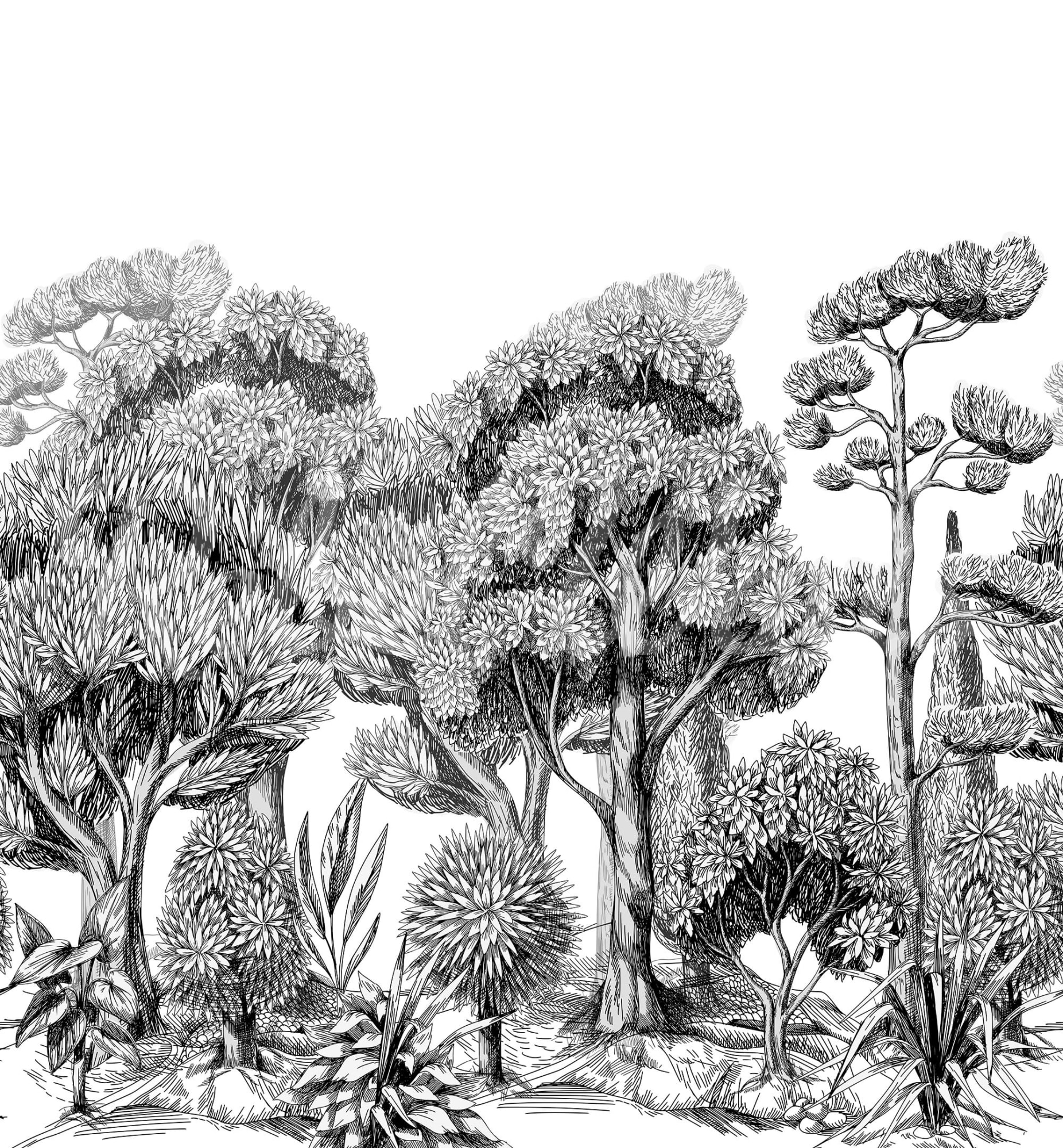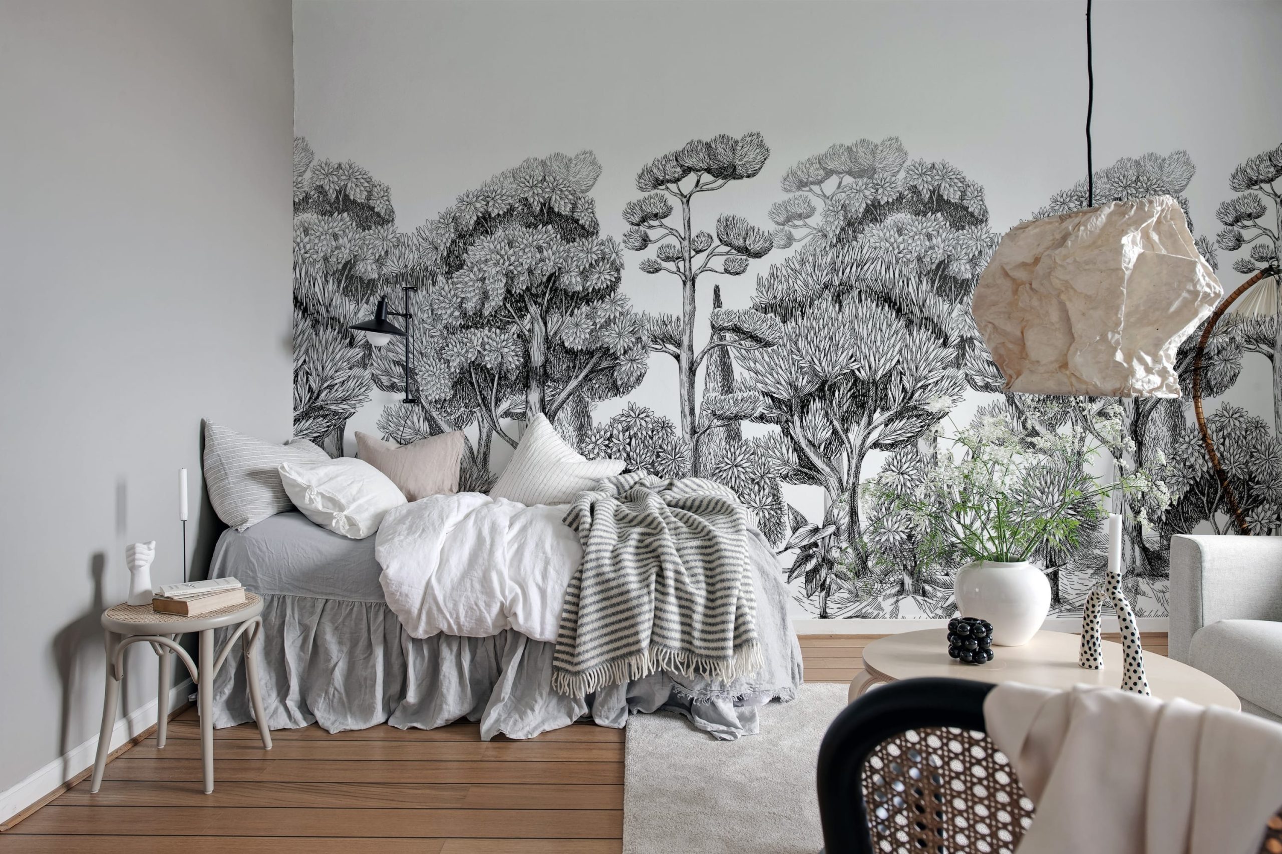 Descoperiți liniștea naturii în interiorul casei dvs. cu ajutorul modelului Forest Park în culori de grafit. Acest tapet prezintă arbori și tufișuri ilustrate frumos în diferite tonuri de gri, oferind o atmosferă relaxantă, perfectă pentru crearea unui sanctuar liniștit.