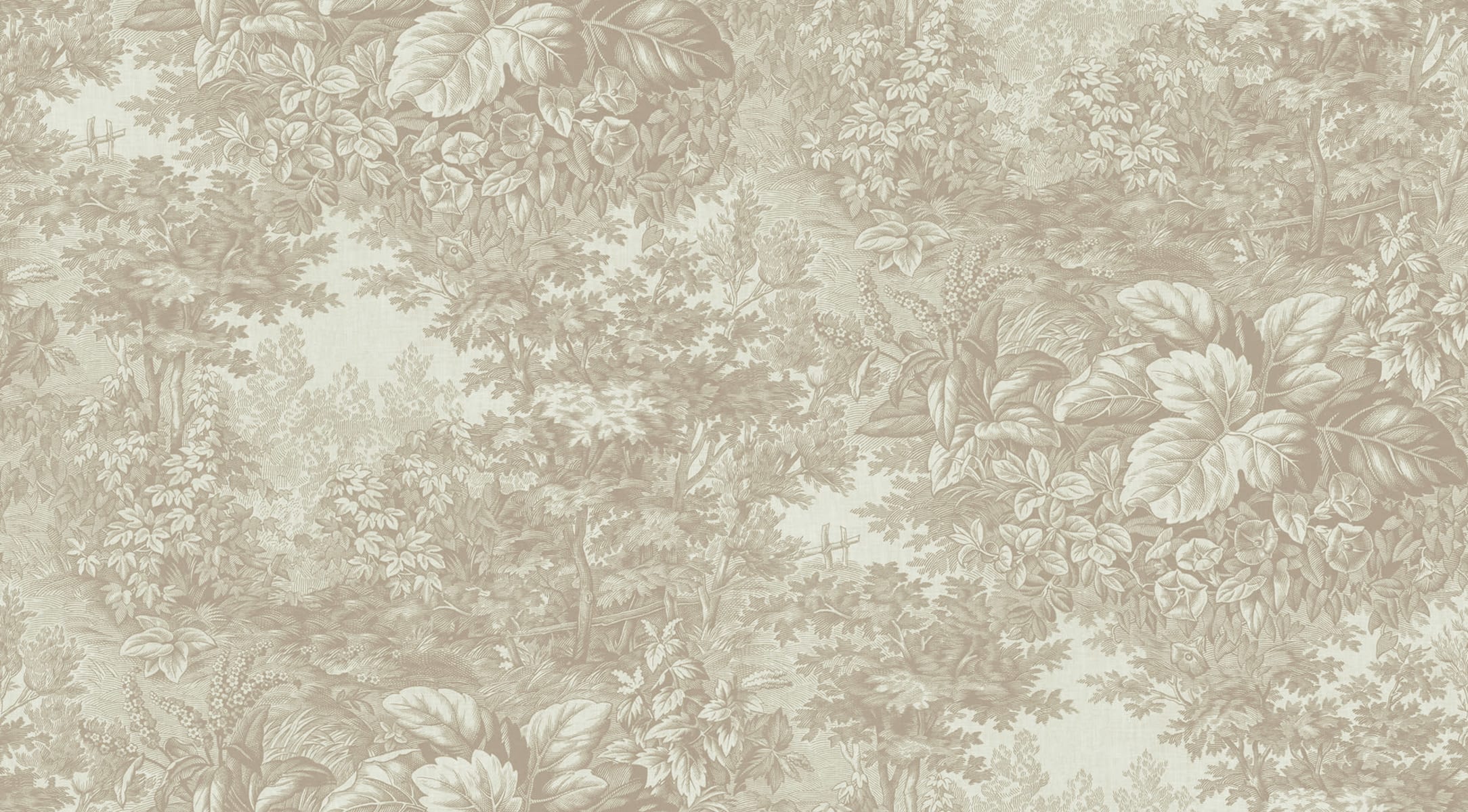 Bazat pe un print textil din Franța secolului al 19-lea, care prezintă poienițe luxuriante din pădure ce se întind ca o pătură care îmbrățișează pereții. Forest Toile, Sandstone are nuanțe de bej nisipos pe un fundal bej.