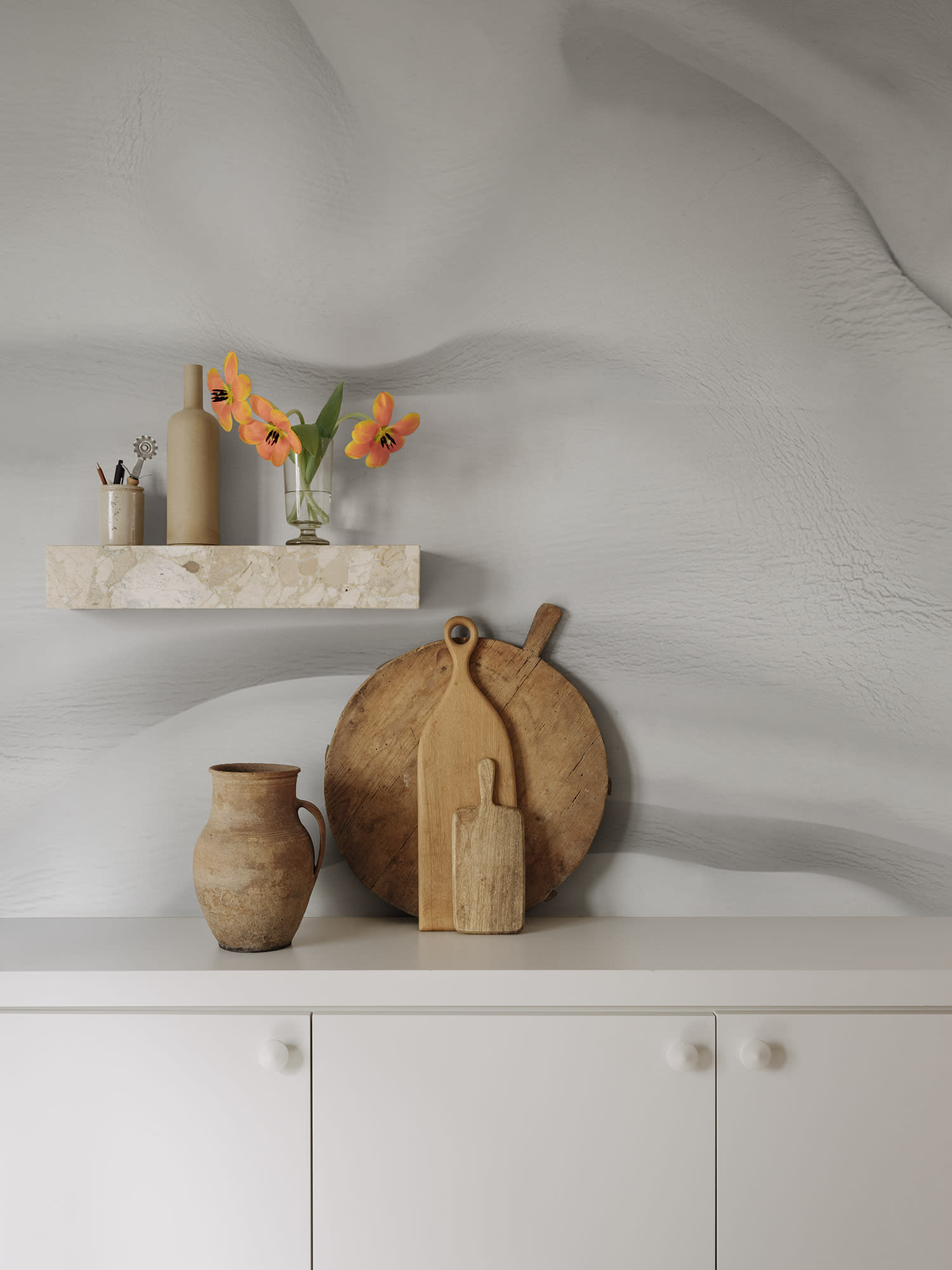 Creativitatea jucausă cu lut s-a transformat în acest design uimitor de organic și tactil, datorită tehnicilor noastre de imprimare digitală de ultimă generație. Scara mare dezvăluie fiecare mic detaliu frumos din lutul alb. Acest design este fără îndoială o adevărată piesă de artă destinată tuturor celor patru pereți rebeli. Hai să-ți revendici spațiul cu lut!