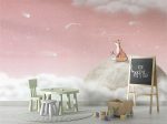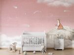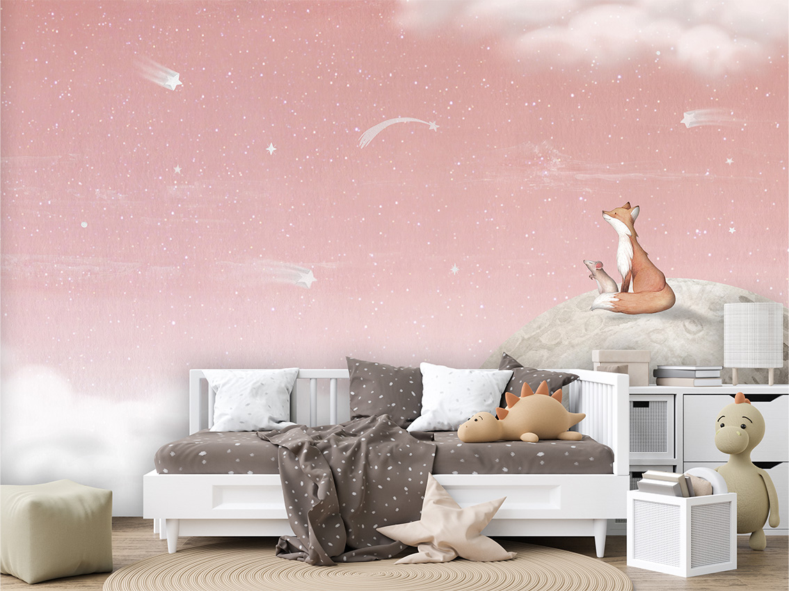 Creează o atmosferă magică în camera copilului tău cu acest tapet încântător. Un decor de poveste cu o vulpe drăguță pe lună, sub un cer roz plin de stele. Ideal pentru un ambient cald și relaxant. Perfect pentru camera bebelușilor și a copiilor mici.