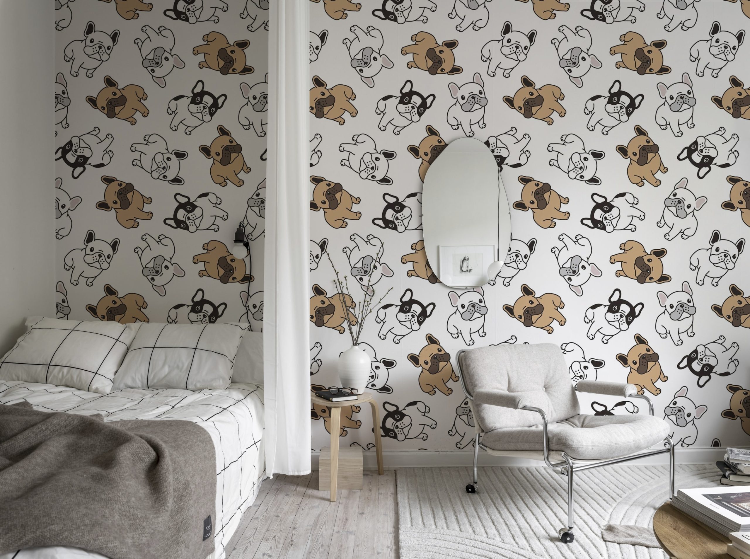 Bucură-te de carisma incontestabilă a Bulldogilor Francezi cu tapetul „Frenchies”. Acest model, cu buldogi ilustrați în nuanțe variate, aduce viață și farmec în orice cameră, dovedind că uneori, cu adevărat, mai mult înseamnă mai vesel!