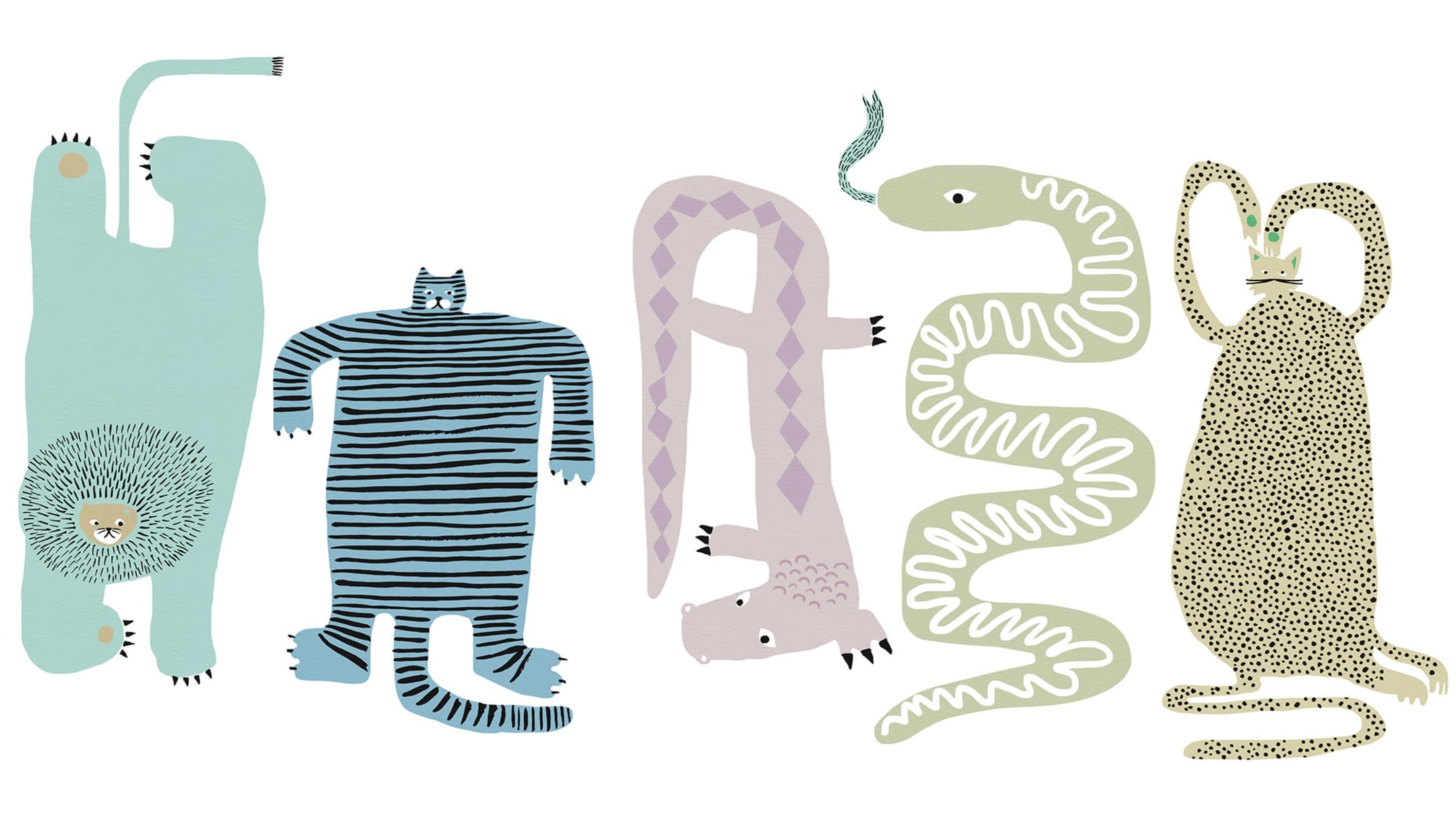 Un ansamblu plin de viață de animale ciudate, fiecare plin de caracter și farmec, acest design creează o atmosferă distractivă și veselă, aducând zâmbete în orice spațiu – un model grafic cool pictat în cerneală. Culoarea Pastel este mai moale, cu prieteni haioși prezentați în pasteluri moi pe un fundal alb: turcoaz, albastru, violet, verde, negru și alb.