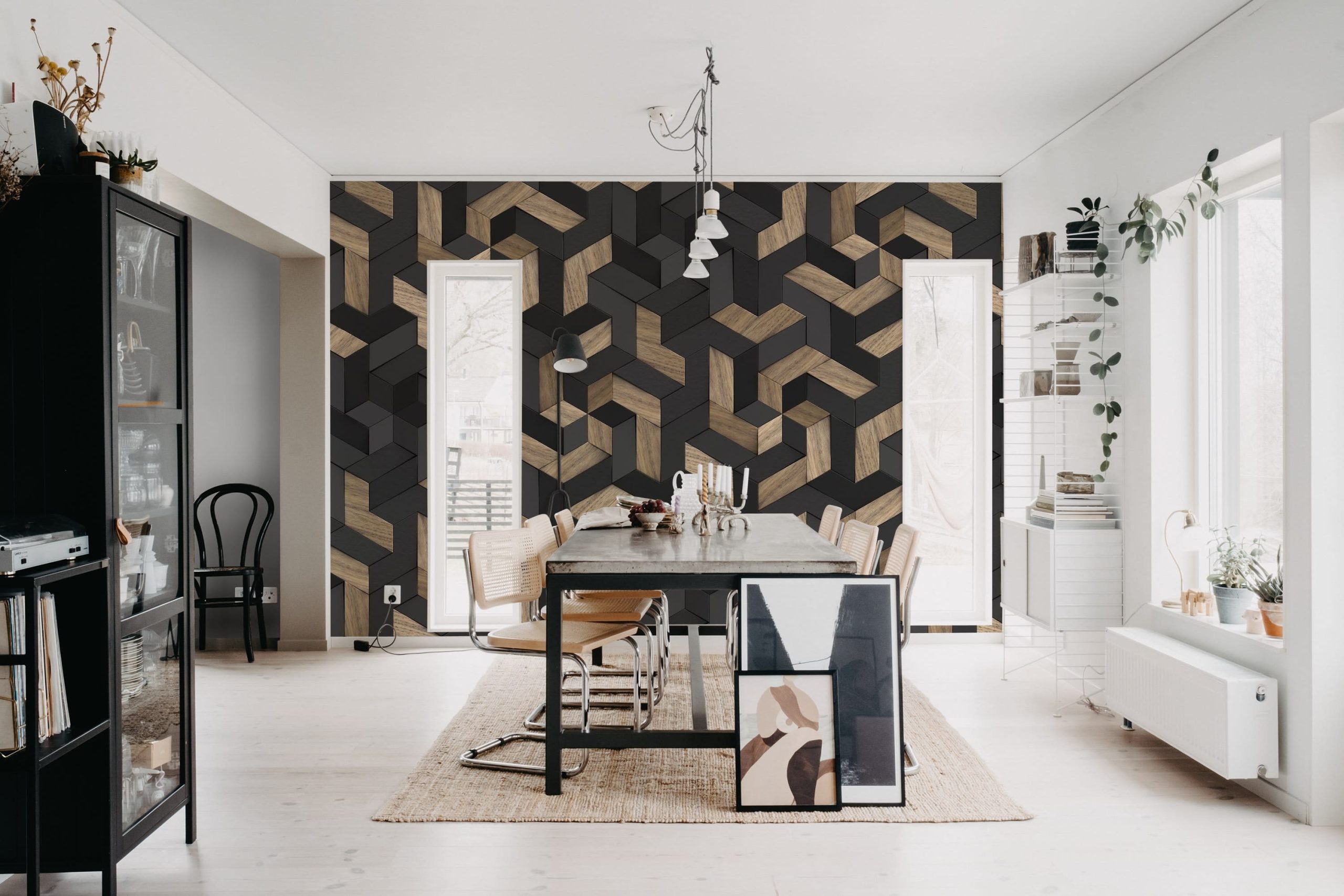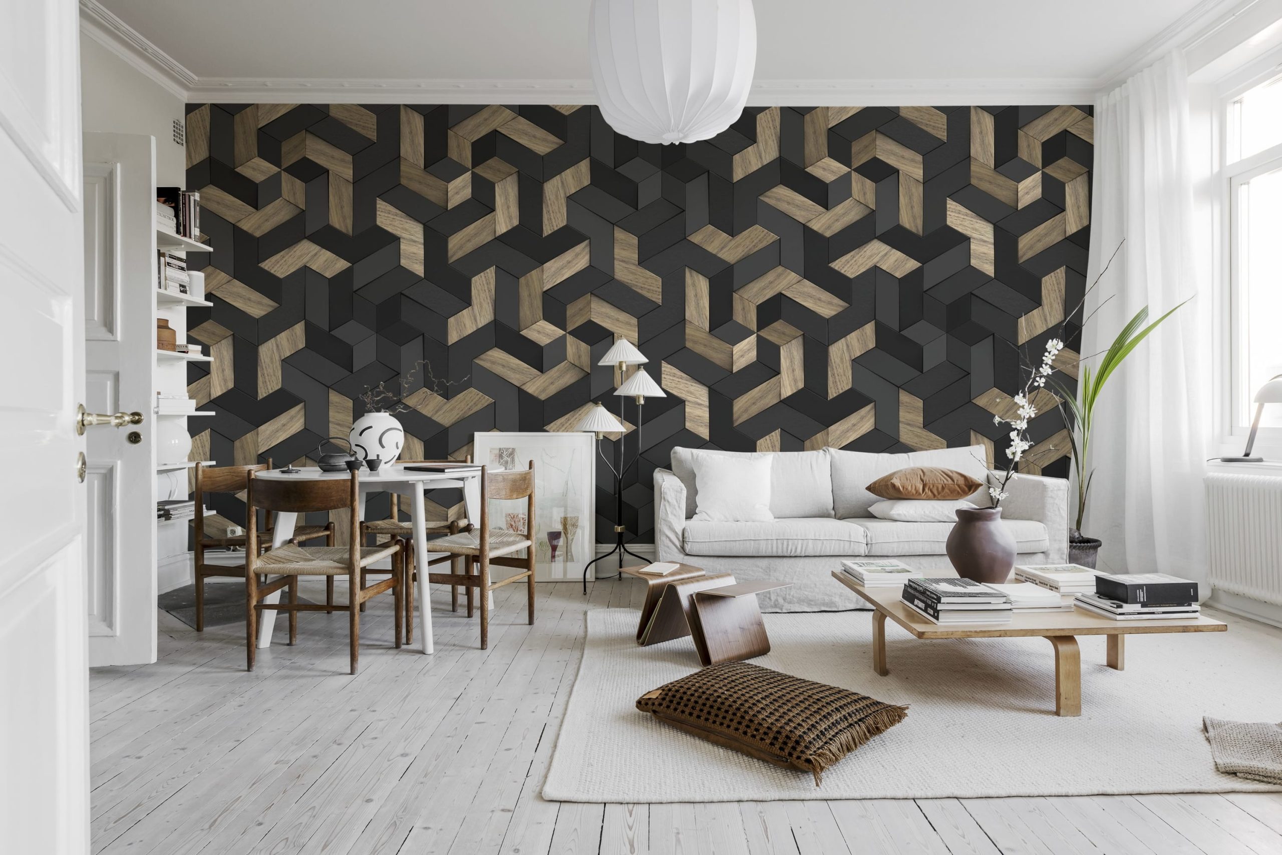 Redefiniți-vă spațiul cu tapetul sofisticat Geometric Wood. Efectul 3D al elementelor de lemn solid, parțial vopsite în negru, creează o atmosferă modernă și rafinată, adăugând adâncime și stil oricărei camere.