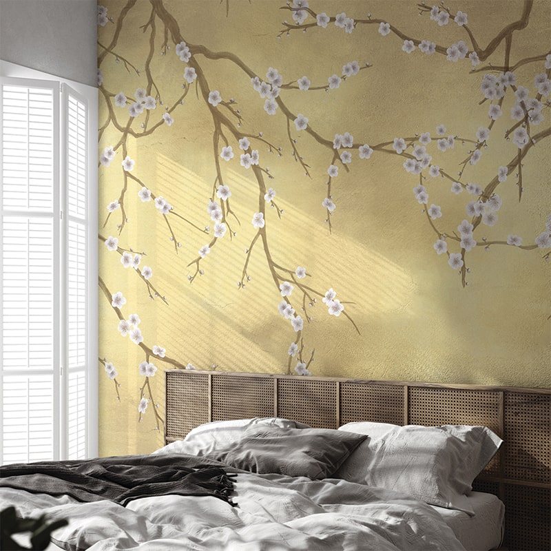 Transformă-ți casa cu un tapet inspirat de frumusețea delicată a florilor de cireș. Fundalul auriu adaugă o notă de lux și rafinament oricărui spațiu.