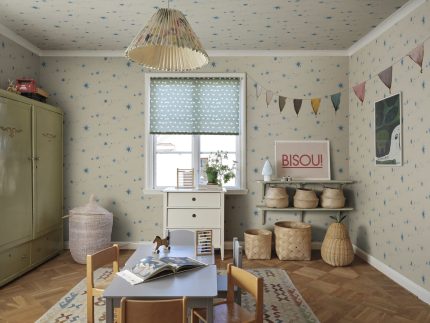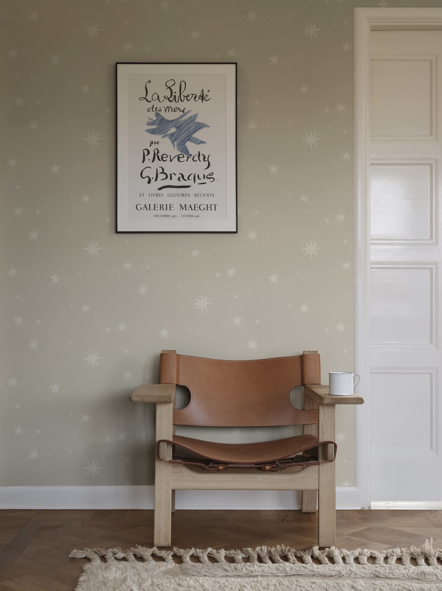 Stelele frumoase pictate manual dansează pe hârtie ca stelele pe cer. Creat împreună cu Johanna Bradford ca tapet de tavan, funcționează de asemenea minunat și pe perete. Schema de culori Sandstone vine în bej moale.